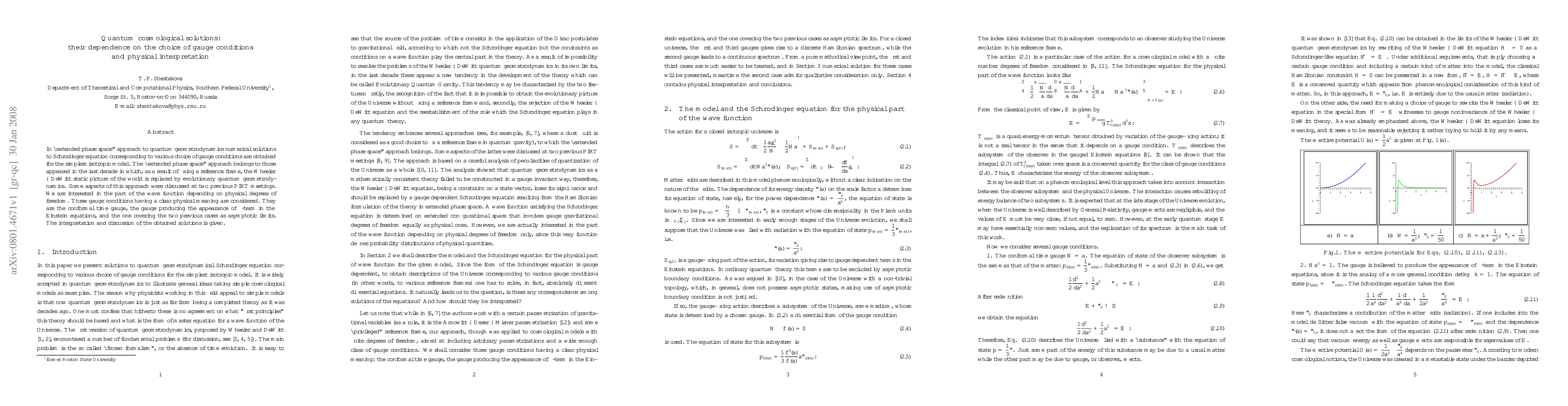 In "extended phase space" approach to quantum geometrodynamics numerical solutions to Schrodinger equation corresponding to various choice of gauge conditions are obtained for the simplest isotropic model. The "extended phase space" approach belongs to those appeared in the last decade in which, as a result of fixing a reference frame, the Wheeler - DeWitt static picture of the world is replaced by evolutionary quantum geometrodynamics. Some aspects of this approach were discussed at two previous PIRT meetings. We are interested in the part of the wave function depending on physical degrees of freedom. Three gauge conditions having a clear physical meaning are considered. They are the conformal time gauge, the gauge producing the appearance of Lambda-term in the Einstein equations, and the one covering the two previous cases as asymptotic limits. The interpretation and discussion of the obtained solutions is given.