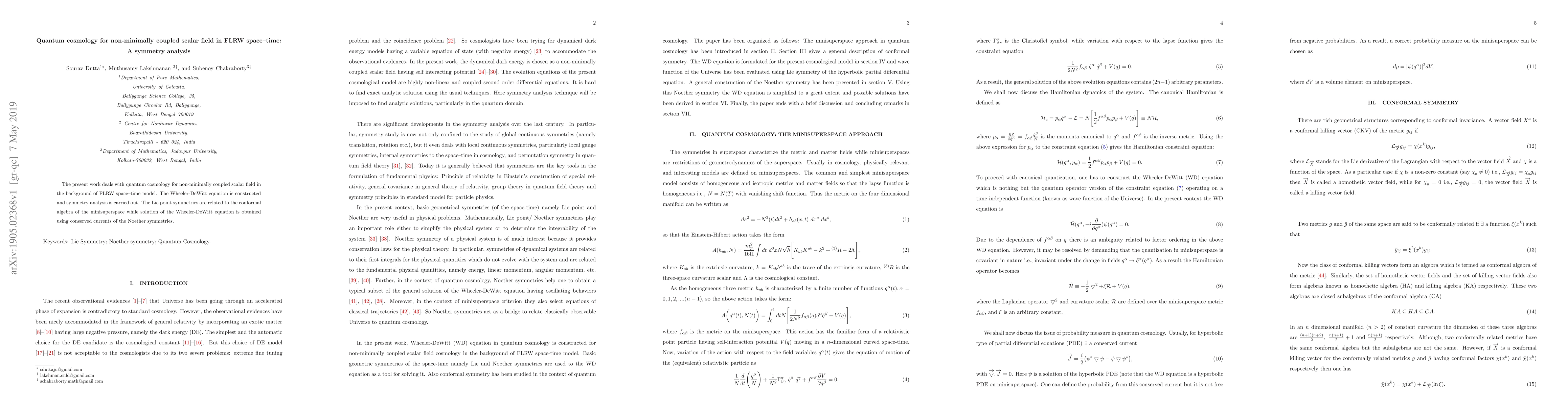 This paper constructs the Wheeler-DeWitt equation for quantum cosmology involving a non-minimally coupled scalar field in a FLRW space-time. It employs symmetry analysis, linking Lie point symmetries to the conformal algebra of the minisuperspace, and solves the equation using conserved currents from Noether symmetries.