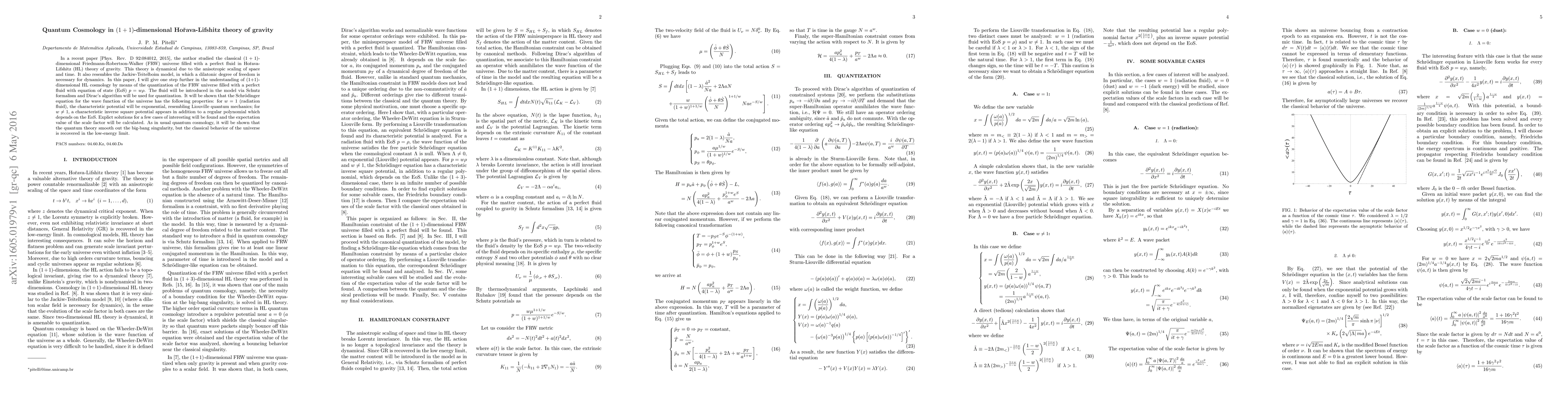 In a recent paper [Phys. Rev. D 92:084012, 2015], the author studied the classical $(1+1)$-dimensional Friedmann-Robertson-Walker (FRW) universe filled with a perfect fluid in Ho\v{r}ava-Lifshitz (HL) theory of gravity. This theory is dynamical due to the anisotropic scaling of space and time. It also resembles the Jackiw-Teitelboim model, in which a dilatonic degree of freedom is necessary for dynamics. In this paper, I will give one step further in the understanding of (1+1)-dimensional HL cosmology by means of the quantization of the FRW universe filled with a perfect fluid with equation of state (EoS) $p=w\rho$. The fluid will be introduced in the model via Schutz formalism and Dirac's algorithm will be used for quantization. It will be shown that the Schr\"odinger equation for the wave function of the universe has the following properties: for $w=1$ (radiation fluid), the characteristic potential will be exponential, resembling Liouville quantum mechanics; for $w\neq 1$, a characteristic inverse square potential appears in addition to a regular polynomial which depends on the EoS. Explict solutions for a few cases of interesting will be found and the expectation value of the scale factor will be calculated. As in usual quantum cosmology, it will be shown that the quantum theory smooth out the big-bang singularity, but the classical behavior of the universe is recovered in the low-energy limit.