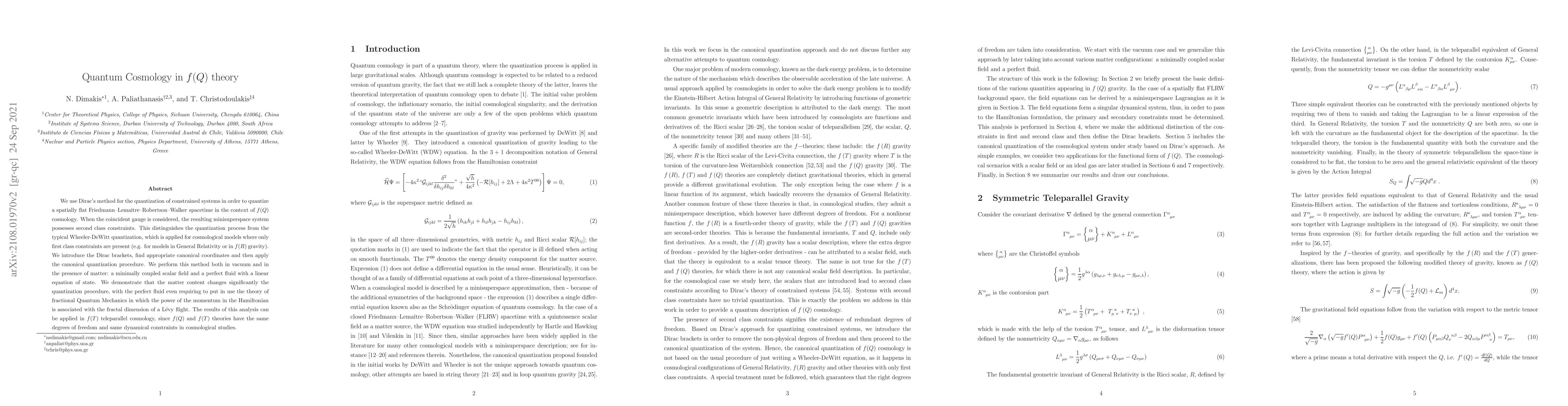 We use Dirac's method for the quantization of constrained systems in order to quantize a spatially flat Friedmann-Lema\^{i}tre-Robertson-Walker spacetime in the context of $f(Q)$ cosmology. When the coincident gauge is considered, the resulting minisuperspace system possesses second class constraints. This distinguishes the quantization process from the typical Wheeler-DeWitt quantization, which is applied for cosmological models where only first class constraints are present (e.g. for models in General Relativity or in $f(R)$ gravity). We introduce the Dirac brackets, find appropriate canonical coordinates and then apply the canonical quantization procedure. We perform this method both in vacuum and in the presence of matter: a minimally coupled scalar field and a perfect fluid with a linear equation of state. We demonstrate that the matter content changes significantly the quantization procedure, with the perfect fluid even requiring to put in use the theory of fractional Quantum Mechanics in which the power of the momentum in the Hamiltonian is associated with the fractal dimension of a L\'evy flight. The results of this analysis can be applied in $f(T)$ teleparallel cosmology, since $f(Q)$ and $f(T)$ theories have the same degrees of freedom and same dynamical constraints in cosmological studies.