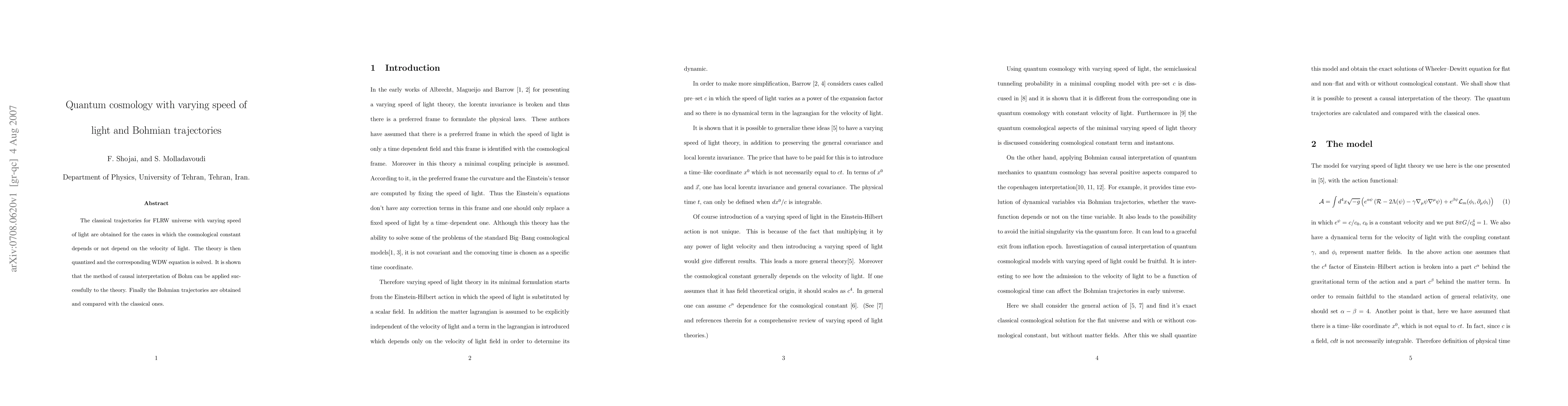 Researchers explored a quantum cosmology theory with varying speed of light and Bohmian trajectories, finding that causal interpretation can apply to the model and producing identical Bohmian paths as classical models.