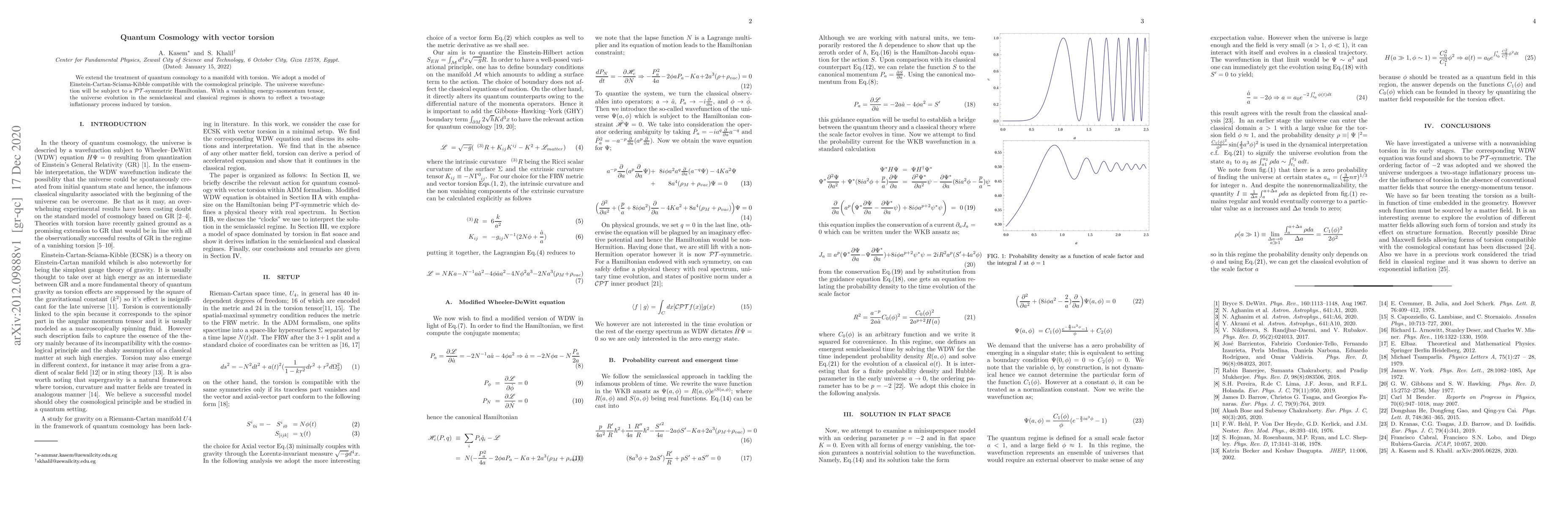 We extend the treatment of quantum cosmology to a manifold with torsion. We adopt a model of Einstein-Cartan-Sciama-Kibble compatible with the cosmological principle. The universe wavefunction will be subject to a $\mathcal{PT}$-symmetric Hamiltonian. With a vanishing energy-momentum tensor, the universe evolution in the semiclassical and classical regimes is shown to reflect a two-stage inflationary process induced by torsion.