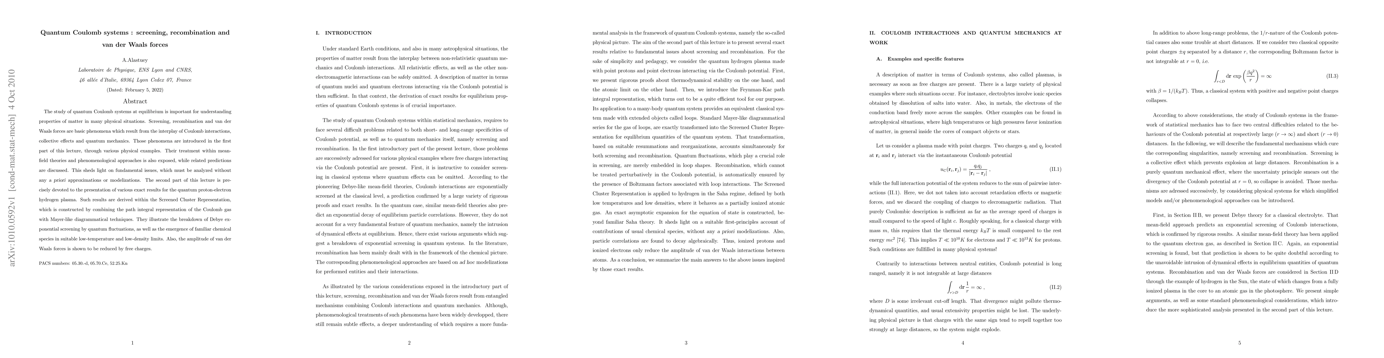 This research paper explores quantum Coulomb systems, focusing on screening, recombination, and van der Waals forces through exact results derived from the Screened Cluster Representation. The study sheds light on fundamental issues in matter properties and chemical species formation.