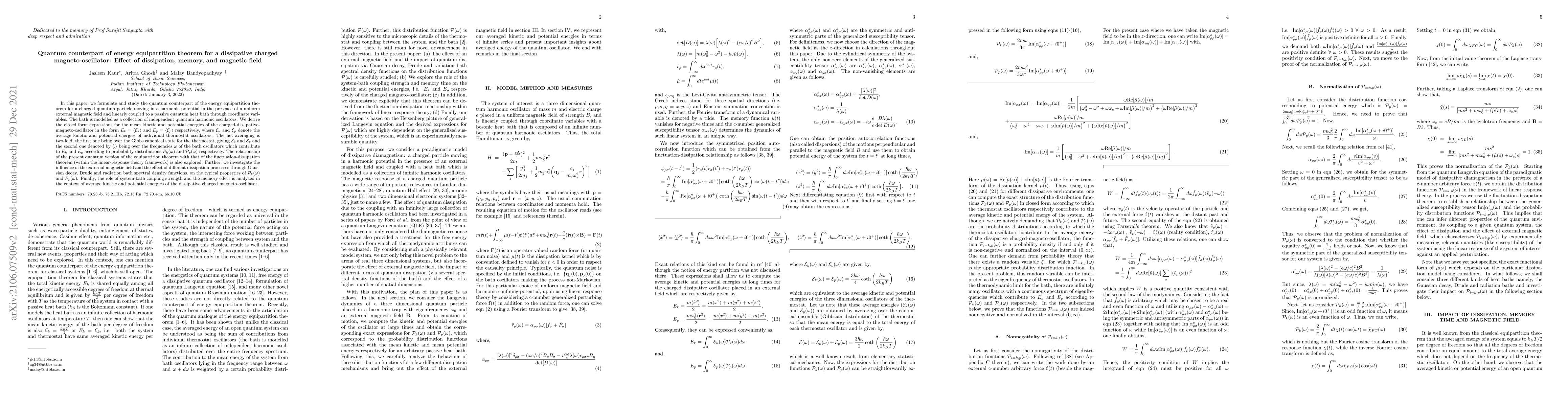 This paper formulates the quantum version of the energy equipartition theorem for a charged quantum particle in a harmonic potential with a magnetic field, coupled to a quantum heat bath. It explores the effects of dissipation, memory, and magnetic fields on the mean kinetic and potential energies, and relates these findings to the fluctuation-dissipation theorem.