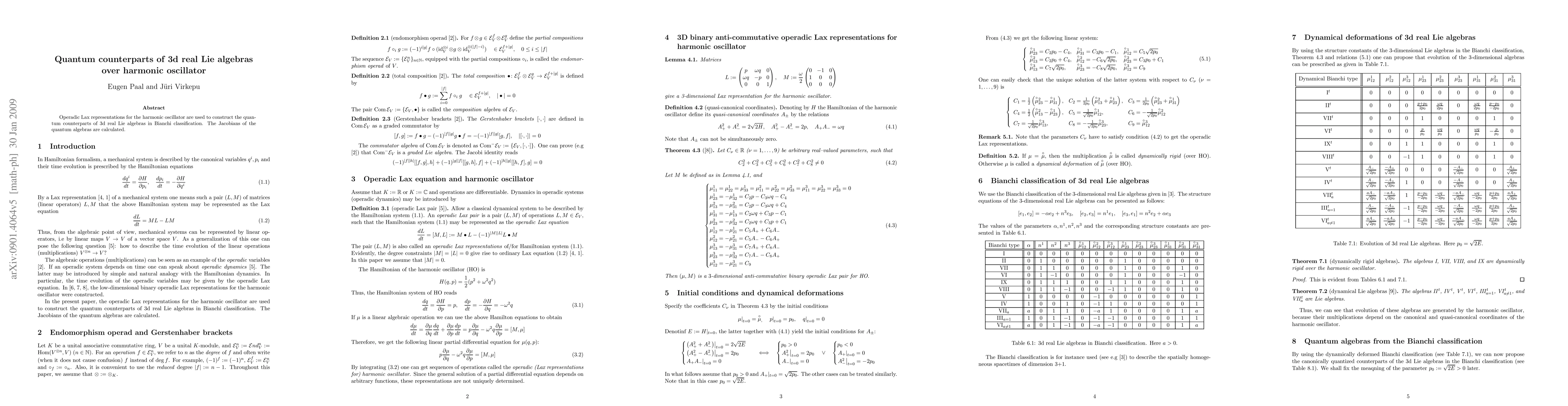 Summary: This paper constructs quantum versions of 3D real Lie algebras using operadic Lax representations for the harmonic oscillator, and computes the Jacobians of these quantum algebras.