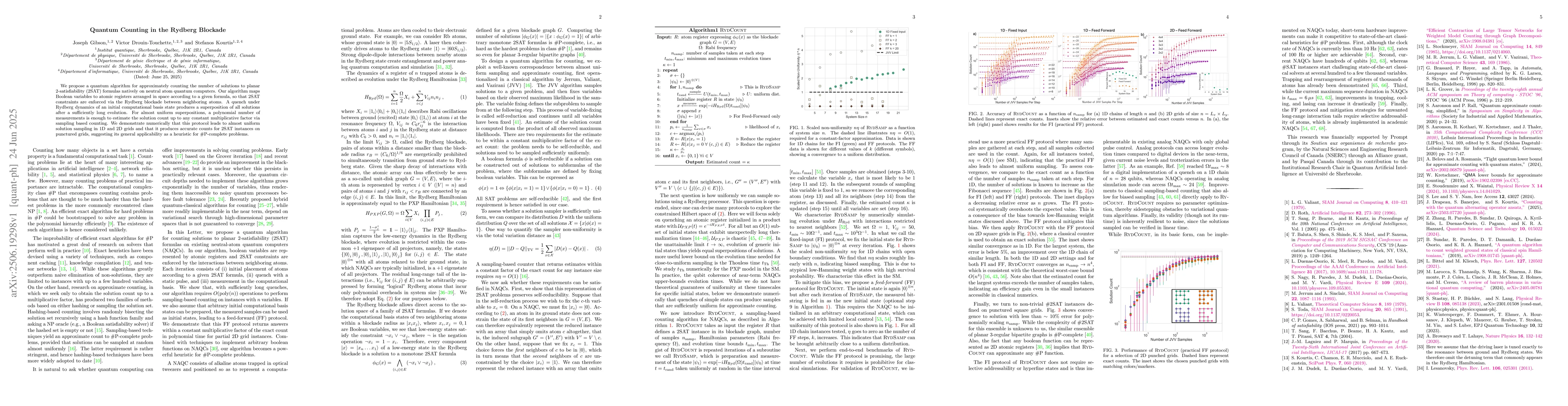 We propose a quantum algorithm for approximately counting the number of solutions to planar 2-satisfiability (2SAT) formulas natively on neutral atom quantum computers. Our algorithm maps Boolean variables to atomic registers arranged in space according to a given formula, so that 2SAT constraints are enforced via the Rydberg blockade between neighboring atoms. A quench under Rydberg dynamics of an initial computational basis state produces a superposition of all solutions after a sufficiently long evolution. For almost uniform superpositions, a polynomial number of measurements is enough to estimate the solution count up to any constant multiplicative factor via sampling based counting. We demonstrate numerically that this protocol leads to almost uniform solution sampling in 1D and 2D grids and that it produces accurate counts for 2SAT instances on punctured grids, suggesting its general applicability as a heuristic for #P-complete problems.