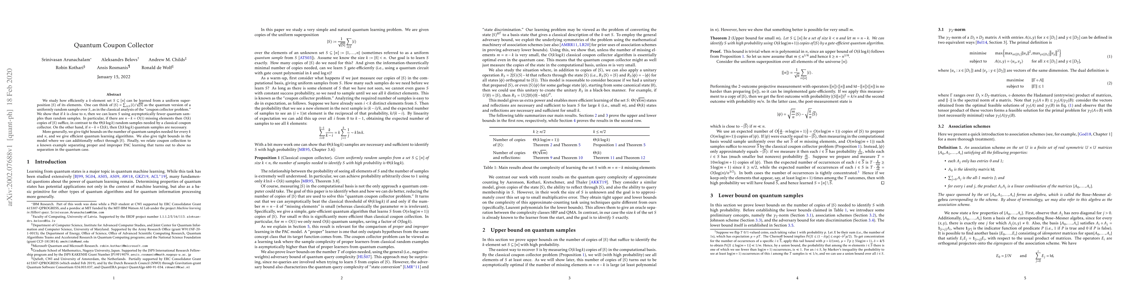 We study how efficiently a $k$-element set $S\subseteq[n]$ can be learned from a uniform superposition $|S\rangle$ of its elements. One can think of $|S\rangle=\sum_{i\in S}|i\rangle/\sqrt{|S|}$ as the quantum version of a uniformly random sample over $S$, as in the classical analysis of the ``coupon collector problem.'' We show that if $k$ is close to $n$, then we can learn $S$ using asymptotically fewer quantum samples than random samples. In particular, if there are $n-k=O(1)$ missing elements then $O(k)$ copies of $|S\rangle$ suffice, in contrast to the $\Theta(k\log k)$ random samples needed by a classical coupon collector. On the other hand, if $n-k=\Omega(k)$, then $\Omega(k\log k)$ quantum samples are~necessary. More generally, we give tight bounds on the number of quantum samples needed for every $k$ and $n$, and we give efficient quantum learning algorithms. We also give tight bounds in the model where we can additionally reflect through $|S\rangle$. Finally, we relate coupon collection to a known example separating proper and improper PAC learning that turns out to show no separation in the quantum case.