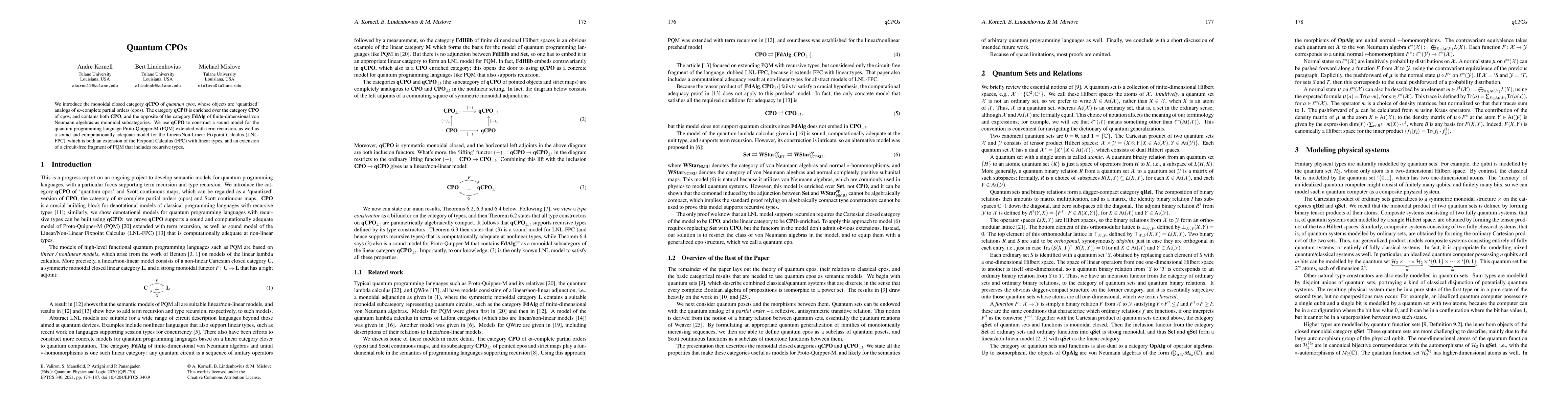 We introduce the monoidal closed category qCPO of quantum cpos, whose objects are "quantized" analogs of omega-complete partial orders (cpos). The category qCPO is enriched over the category CPO of cpos, and contains both CPO, and the opposite of the category FdAlg of finite-dimensional von Neumann algebras as monoidal subcategories. We use qCPO to construct a sound model for the quantum programming language Proto-Quipper-M (PQM) extended with term recursion, as well as a sound and computationally adequate model for the Linear/Non-Linear Fixpoint Calculus (LNL-FPC), which is both an extension of the Fixpoint Calculus (FPC) with linear types, and an extension of a circuit-free fragment of PQM that includes recursive types.