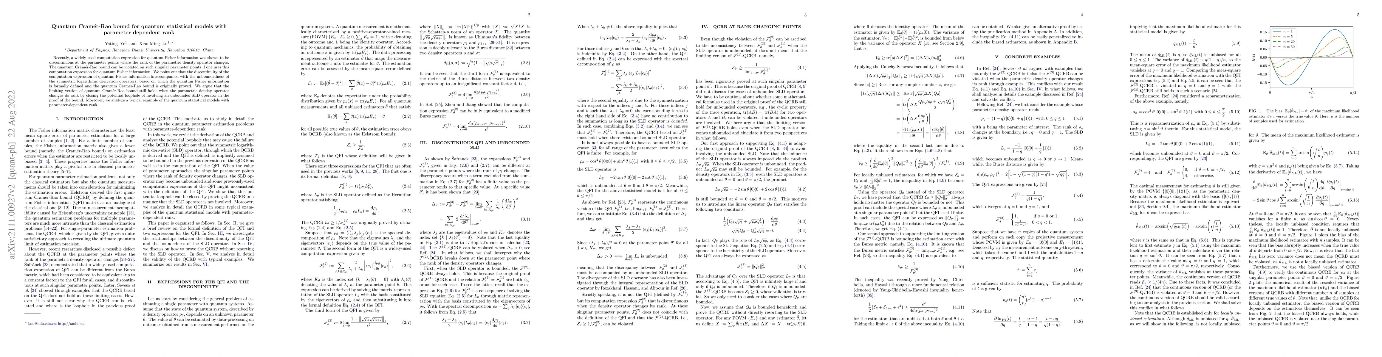 This paper addresses the discontinuity in the computation of quantum Fisher information at points where the rank of the parametric density operator changes, which can lead to violations of the quantum Cram\'er-Rao bound. It proposes that the limiting version of the quantum Cram\'er-Rao bound remains valid despite the unboundedness of the symmetric logarithmic derivation operators, and analyzes a specific example of quantum statistical models with parameter-dependent rank.