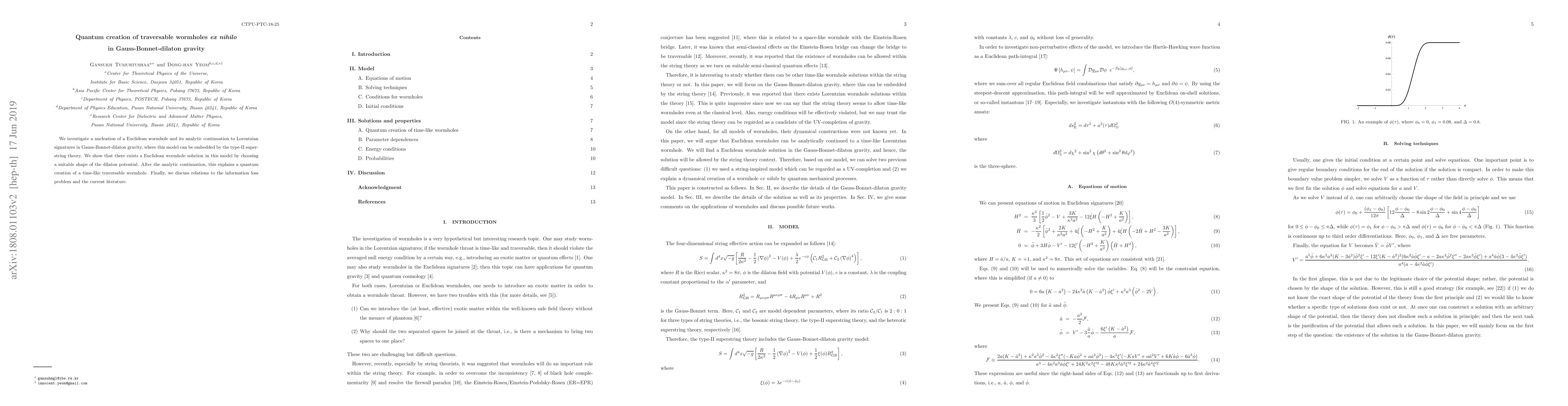 This paper explores the quantum creation of traversable wormholes in Gauss-Bonnet-dilaton gravity, demonstrating a Euclidean wormhole solution through a specific dilaton potential. The analytic continuation to Lorentzian signatures suggests the possibility of a time-like traversable wormhole, with implications for the information loss problem.