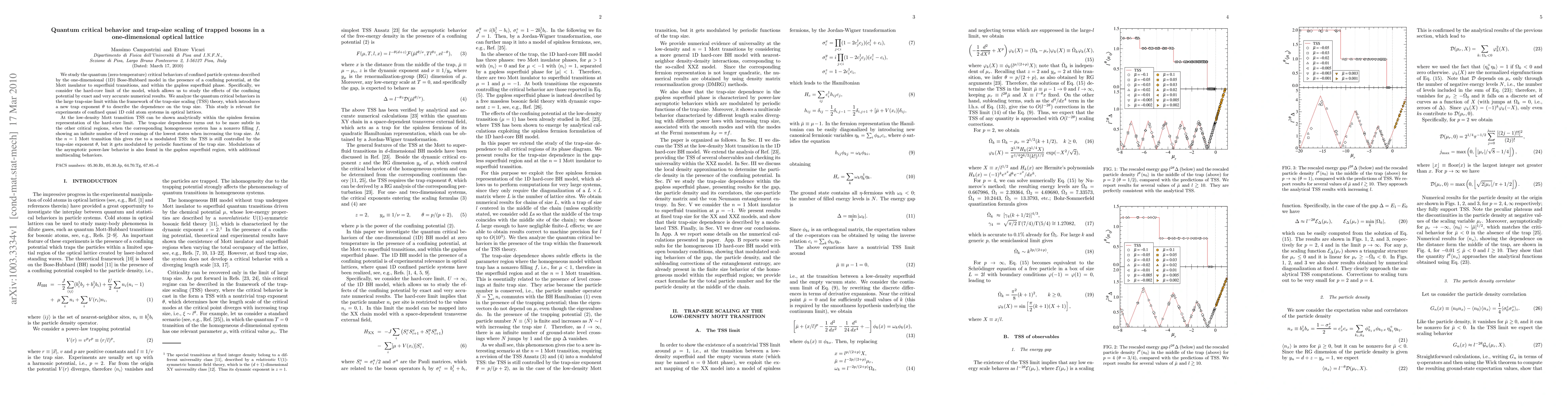 This paper investigates the quantum critical behavior of trapped bosons in a one-dimensional optical lattice, focusing on the Mott insulator to superfluid transition and the gapless superfluid phase. It employs the trap-size scaling (TSS) theory to analyze the effects of the confining potential, introducing a new trap exponent, theta, to describe the dependence on trap size.