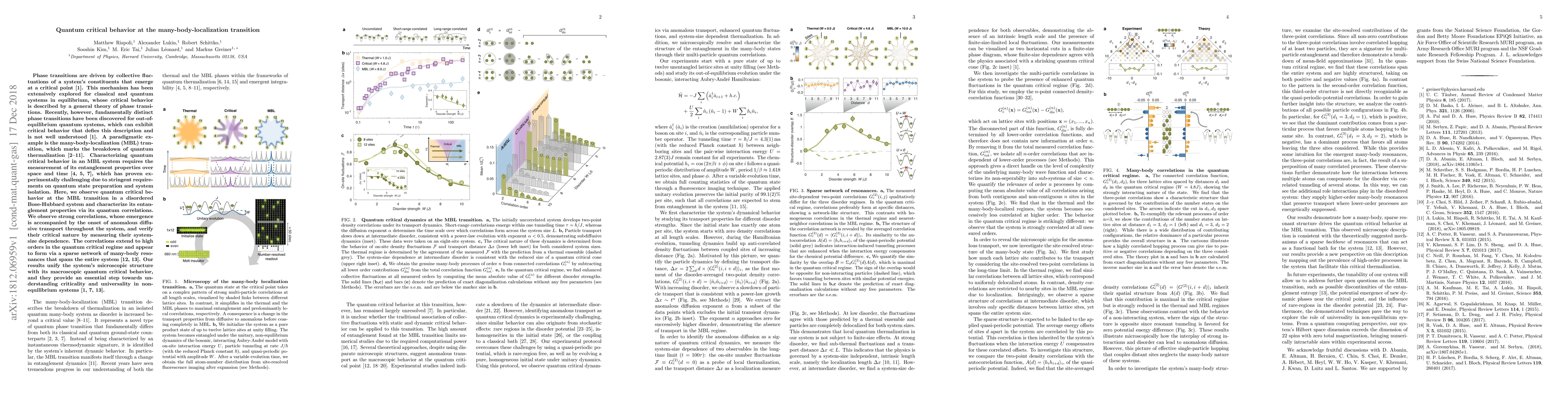This paper observes quantum critical behavior at the many-body-localization transition in a disordered Bose-Hubbard system, revealing strong quantum correlations and anomalous transport. The study provides insights into the entanglement properties and critical nature of these correlations, advancing the understanding of criticality in non-equilibrium quantum systems.