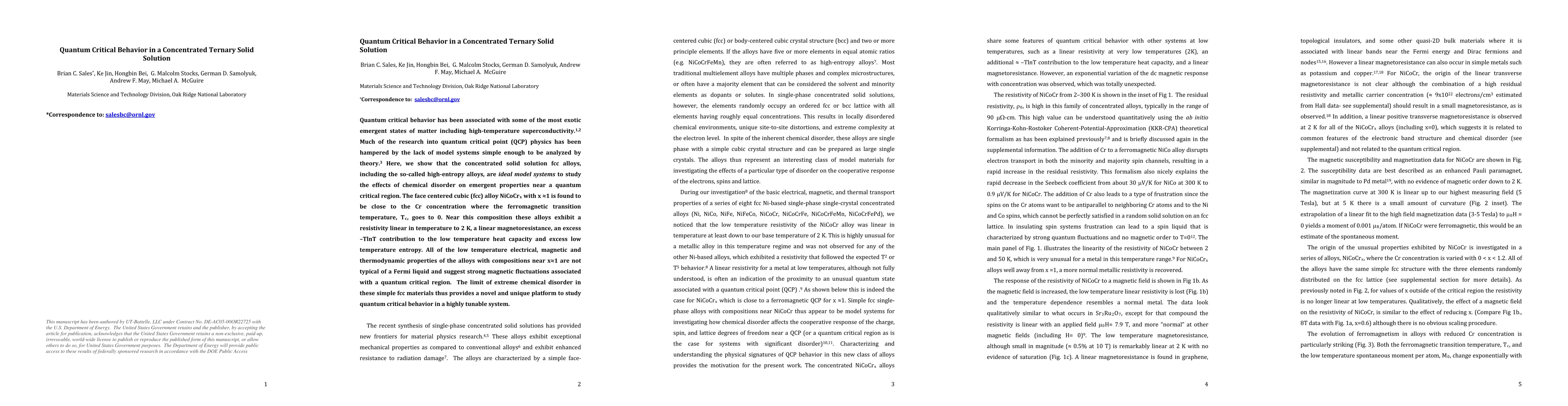 Quantum critical behavior has been associated with some of the most exotic emergent states of matter including high-temperature superconductivity. Much of the research into quantum critical point (QCP) physics has been hampered by the lack of model systems simple enough to be analyzed by theory. Here, we show that the concentrated solid solution fcc alloys, including the so-called high-entropy alloys, are ideal model systems to study the effects of chemical disorder on emergent properties near a quantum critical region. The face centered cubic (fcc) alloy NiCoCrx with x near 1 is found to be close to the Cr concentration where the ferromagnetic transition temperature, Tc, goes to 0. Near this composition these alloys exhibit a resistivity linear in temperature to 2 K, a linear magnetoresistance, an excess -TlnT contribution to the low temperature heat capacity and excess low temperature entropy. All of the low temperature electrical, magnetic and thermodynamic properties of the alloys with compositions near x near 1 are not typical of a Fermi liquid and suggest strong magnetic fluctuations associated with a quantum critical region. The limit of extreme chemical disorder in these simple fcc materials thus provides a novel and unique platform to study quantum critical behavior in a highly tunable system.