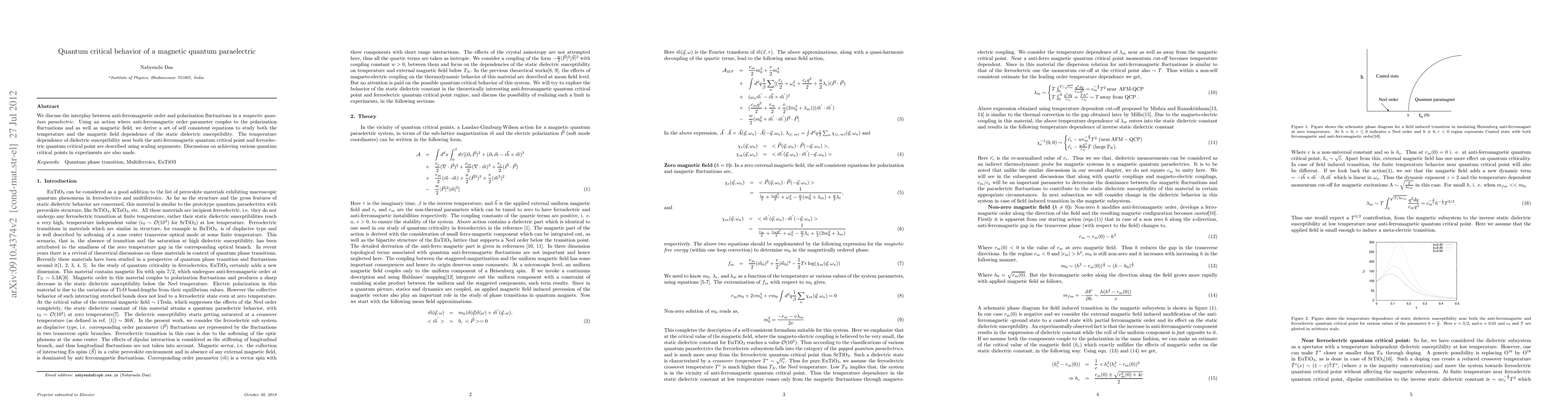 This paper investigates the quantum critical behavior in a magnetic quantum paraelectric, focusing on the interplay between anti-ferromagnetic order and polarization fluctuations. It derives self-consistent equations to study the temperature and magnetic field dependence of static dielectric susceptibility, employing scaling arguments to describe the behavior near critical points, and discusses potential experimental realizations.