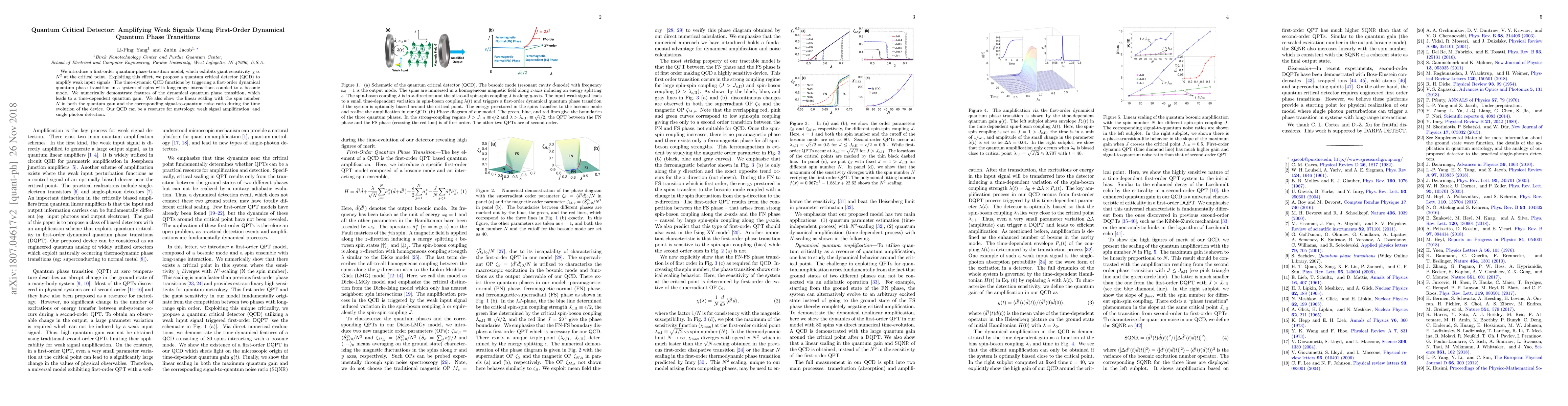 The paper introduces a quantum critical detector (QCD) that amplifies weak signals by triggering a first-order dynamical quantum phase transition in a system of spins. This QCD exhibits a giant sensitivity, scaling as $N^2$, which enhances signal-to-noise ratio and can be useful for metrology and weak signal amplification.