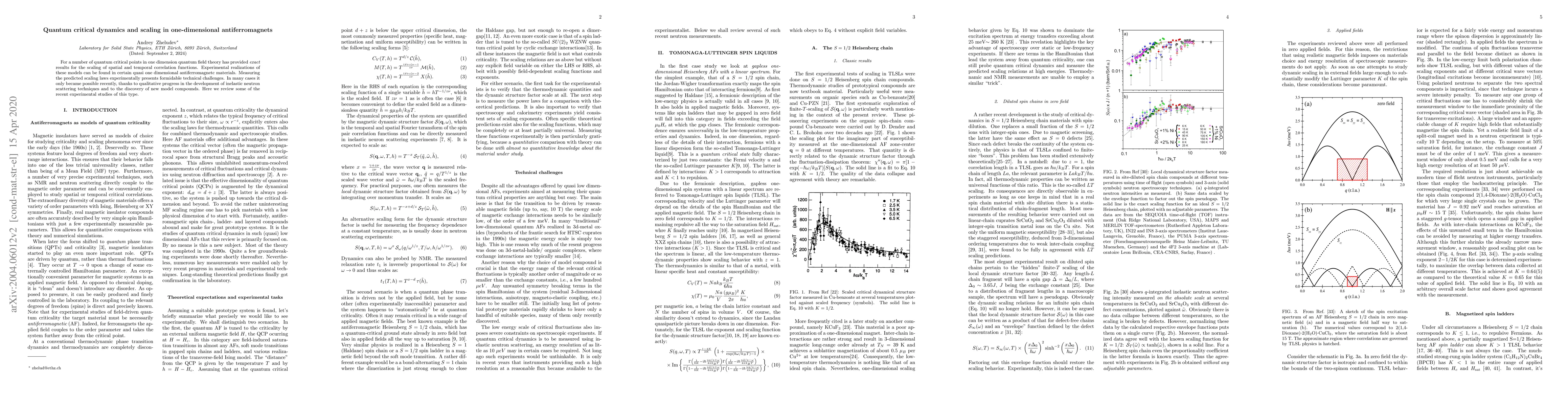 This paper reviews recent experimental studies on quantum critical dynamics and scaling in one-dimensional antiferromagnets, highlighting the exact results provided by quantum field theory and the advancements in inelastic neutron scattering techniques that have made experimental verification possible.