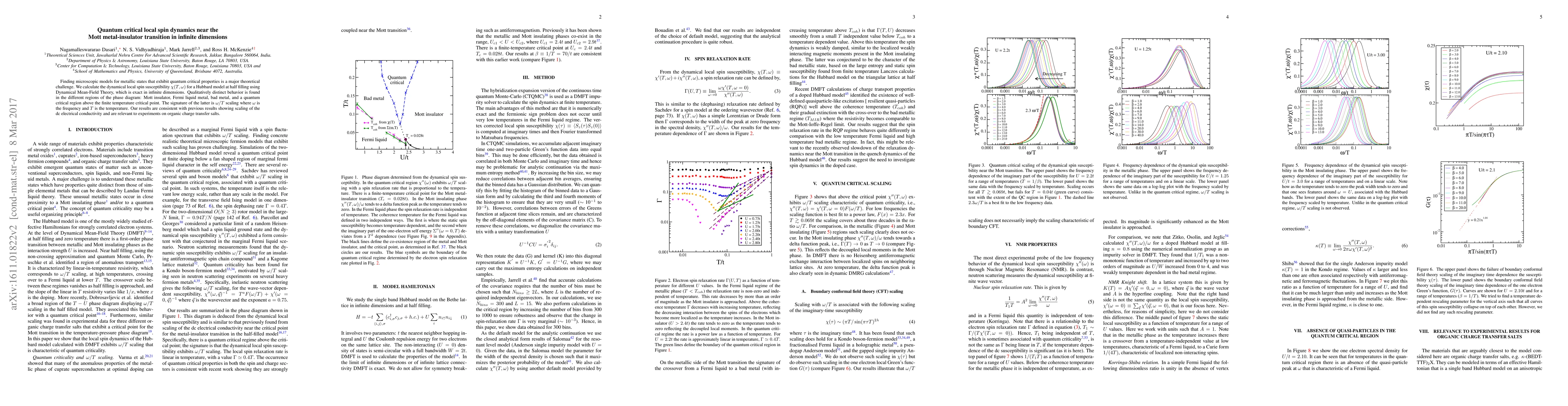 Finding microscopic models for metallic states that exhibit quantum critical properties such as $\omega/T$ scaling is a major theoretical challenge. We calculate the local dynamical spin susceptibility $\chi(T,\omega)$ for a Hubbard model at half filling using Dynamical Mean-Field Theory, which is exact in infinite dimensions. Qualitatively distinct behavior is found in the different regions of the phase diagram: Mott insulator, Fermi liquid metal, bad metal, and a quantum critical region above the finite temperature critical point. The signature of the latter is $\omega/T$ scaling where $T$ is the temperature. Our results are consistent with previous results showing scaling of the dc electrical conductivity and are relevant to experiments on organic charge transfer salts.