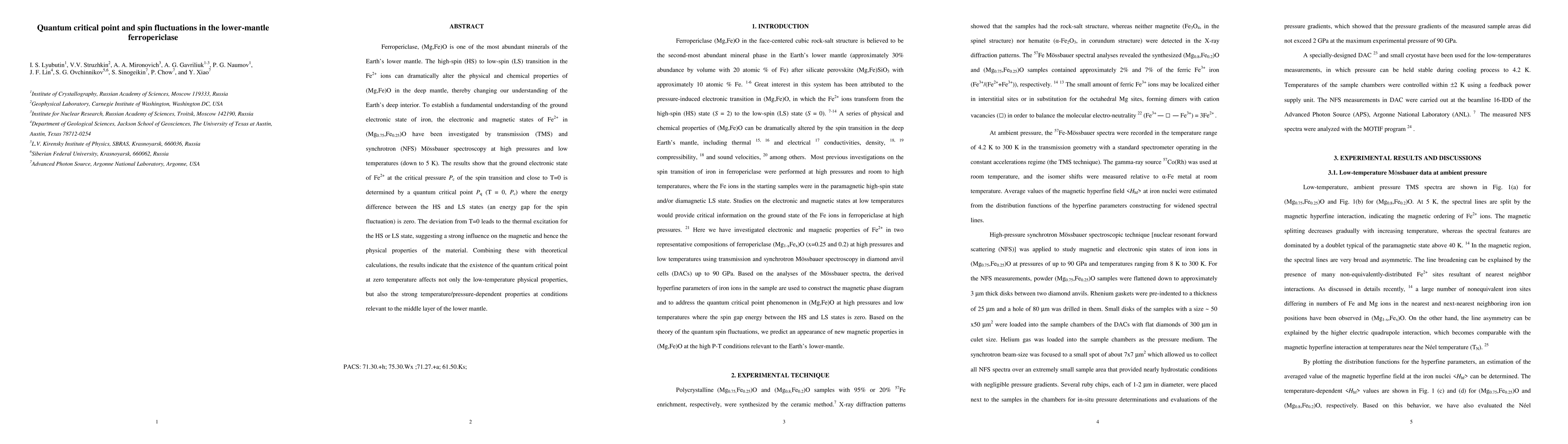 This study investigates the electronic and magnetic states of Fe2+ in ferropericlase using Mössbauer spectroscopy, revealing a quantum critical point at the spin transition pressure where the energy gap between high-spin and low-spin states vanishes. The findings suggest significant impacts on the material's magnetic and physical properties, especially under deep mantle conditions.