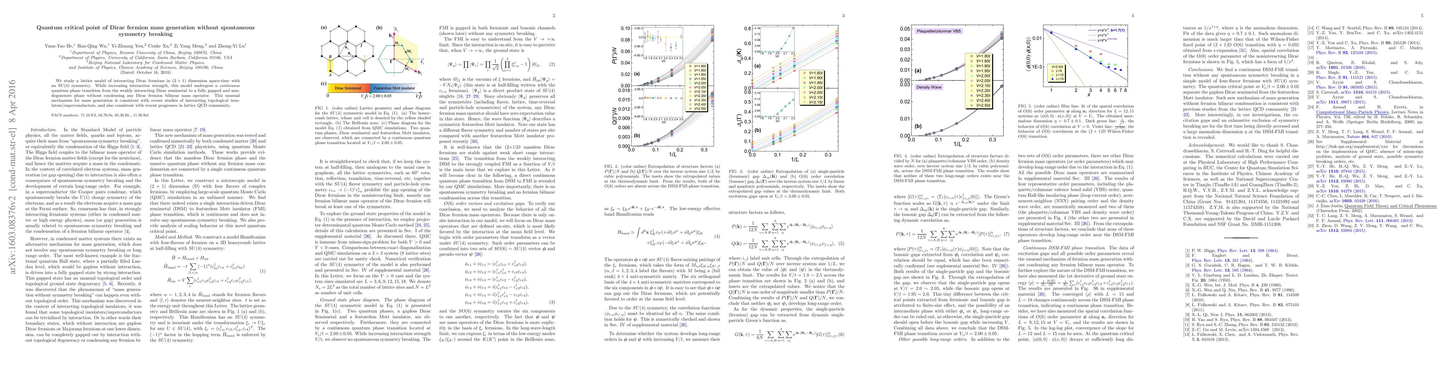 This paper investigates a lattice model of interacting Dirac fermions in $(2+1)$ dimensions undergoing a continuous quantum phase transition to a gapped phase without spontaneous symmetry breaking or conventional mass generation. The mass generation mechanism aligns with recent findings in topological insulators/superconductors and lattice QCD.