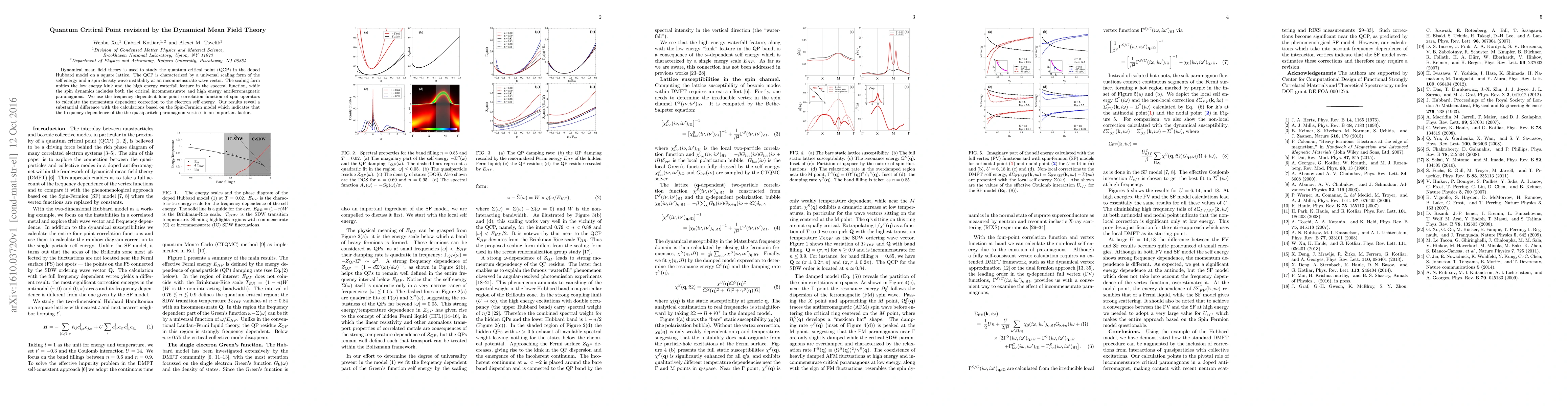 Dynamical mean field theory is used to study the quantum critical point (QCP) in the doped Hubbard model on a square lattice. The QCP is characterized by a universal scaling form of the self energy and a spin density wave instability at an incommensurate wave vector. The scaling form unifies the low energy kink and the high energy waterfall feature in the spectral function, while the spin dynamics includes both the critical incommensurate and high energy antiferromagnetic paramagnons. We use the frequency dependent four-point correlation function of spin operators to calculate the momentum dependent correction to the electron self energy. Our results reveal a substantial difference with the calculations based on the Spin-Fermion model which indicates that the frequency dependence of the the quasiparitcle-paramagnon vertices is an important factor.