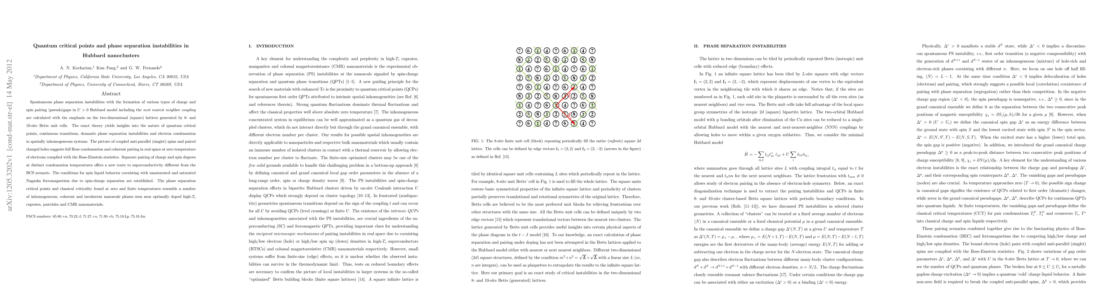 This paper investigates quantum critical points and phase separation in Hubbard nanoclusters, revealing spontaneous instabilities leading to charge and spin pairing. It finds distinct condensation temperatures for charge and spin, suggesting a new superconductivity route and conditions for spin liquid behavior coexisting with ferromagnetism.