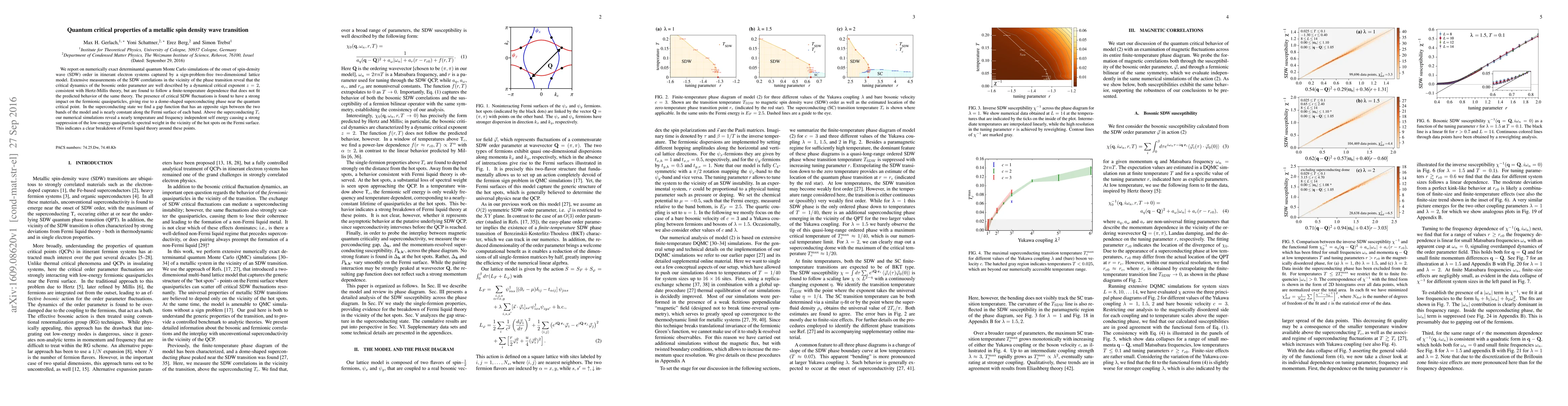We report on numerically exact determinantal quantum Monte Carlo simulations of the onset of spin-density wave (SDW) order in itinerant electron systems captured by a sign-problem-free two-dimensional lattice model. Extensive measurements of the SDW correlations in the vicinity of the phase transition reveal that the critical dynamics of the bosonic order parameter are well described by a dynamical critical exponent z = 2, consistent with Hertz-Millis theory, but are found to follow a finite-temperature dependence that does not fit the predicted behavior of the same theory. The presence of critical SDW fluctuations is found to have a strong impact on the fermionic quasiparticles, giving rise to a dome-shaped superconducting phase near the quantum critical point. In the superconducting state we find a gap function that has an opposite sign between the two bands of the model and is nearly constant along the Fermi surface of each band. Above the superconducting $T_c$ our numerical simulations reveal a nearly temperature and frequency independent self energy causing a strong suppression of the low-energy quasiparticle spectral weight in the vicinity of the hot spots on the Fermi surface. This indicates a clear breakdown of Fermi liquid theory around these points.