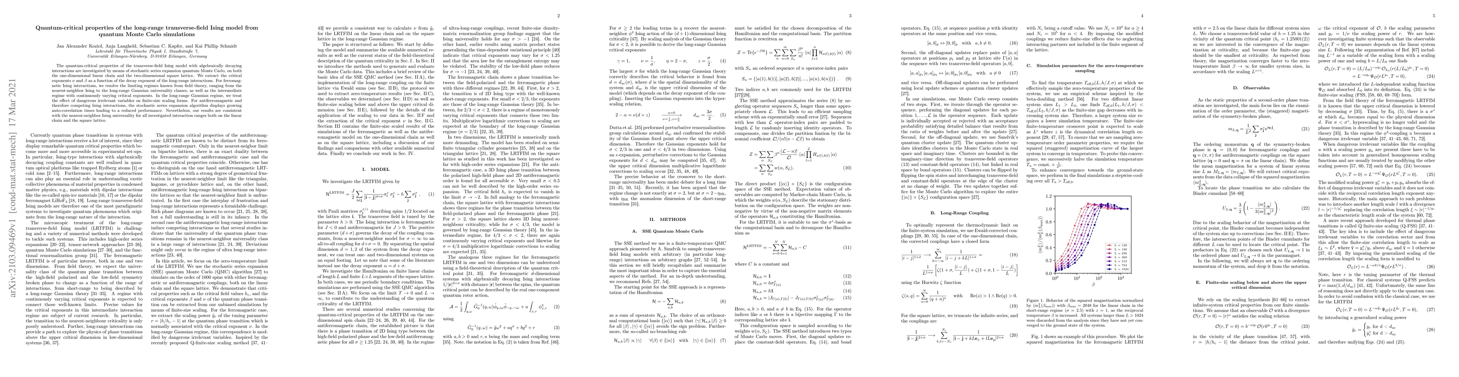 This paper investigates quantum-critical properties of the long-range transverse-field Ising model using quantum Monte Carlo simulations, finding critical exponents $\nu$ and $\beta$ across various interaction regimes, and confirming Gaussian universality in the long-range limit. Despite challenges with antiferromagnetic interactions, results remain consistent with nearest-neighbor Ising behavior.
