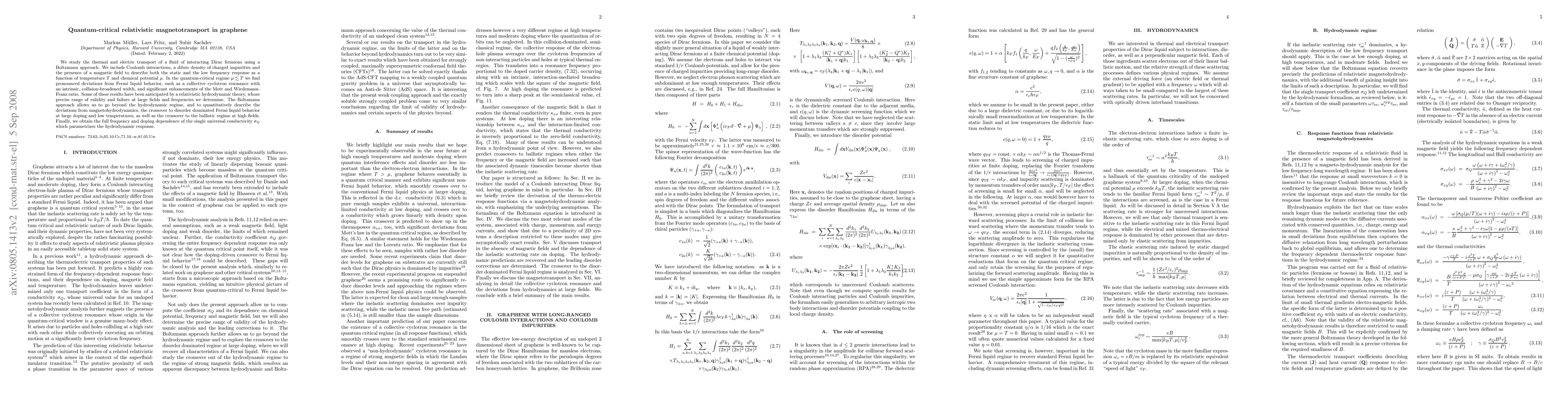 We study the thermal and electric transport of a fluid of interacting Dirac fermions using a Boltzmann approach. We include Coulomb interactions, a dilute density of charged impurities and the presence of a magnetic field to describe both the static and the low frequency response as a function of temperature T and chemical potential mu. In the quantum-critical regime mu << T we find pronounced deviations from Fermi liquid behavior, such as a collective cyclotron resonance with an intrinsic, collision-broadened width, and significant enhancements of the Mott and Wiedemann-Franz ratio. Some of these results have been anticipated by a relativistic hydrodynamic theory, whose precise range of validity and failure at large fields and frequencies we determine. The Boltzmann approach allows us to go beyond the hydrodynamic regime, and to quantitatively describe the deviations from magnetohydrodynamics, the crossover to disorder dominated Fermi liquid behavior at large doping and low temperatures, as well as the crossover to the ballistic regime at high fields. Finally, we obtain the full frequency and doping dependence of the single universal conductivity sigma_Q which parametrizes the hydrodynamic response.