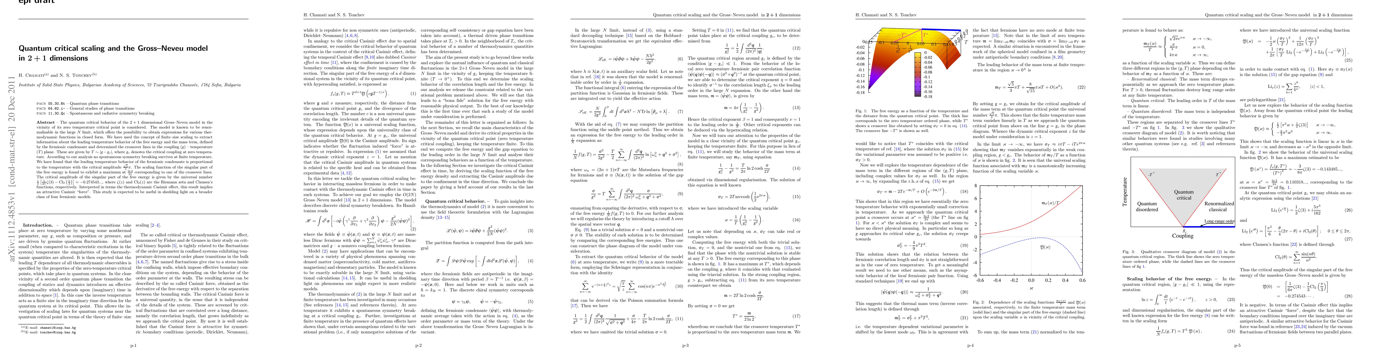 The quantum critical behavior of the 2+1 dimensional Gross--Neveu model in the vicinity of its zero temperature critical point is considered. The model is known to be renormalisable in the large $N$ limit, which offers the possibility to obtain expressions for various thermodynamic functions in closed form. We have used the concept of finite--size scaling to extract information about the leading temperature behavior of the free energy and the mass term, defined by the fermionic condensate and determined the crossover lines in the coupling ($\g$) -- temperature ($T$) plane. These are given by $T\sim|\g-\g_c|$, where $\g_c$ denotes the critical coupling at zero temperature. According to our analysis no spontaneous symmetry breaking survives at finite temperature. We have found that the leading temperature behavior of the fermionic condensate is proportional to the temperature with the critical amplitude $\frac{\sqrt{5}}3\pi$. The scaling function of the singular part of the free energy is found to exhibit a maximum at $\frac{\ln2}{2\pi}$ corresponding to one of the crossover lines. The critical amplitude of the singular part of the free energy is given by the universal number $\frac13[\frac1{2\pi}\zeta(3)-\mathrm{Cl}_2(\frac{\pi}3)]=-0.274543...$, where $\zeta(z)$ and $\mathrm{Cl}_2(z)$ are the Riemann zeta and Clausen's functions, respectively. Interpreted in terms the thermodynamic Casimir effect, this result implies an attractive Casimir "force". This study is expected to be useful in shedding light on a broader class of four fermionic models.