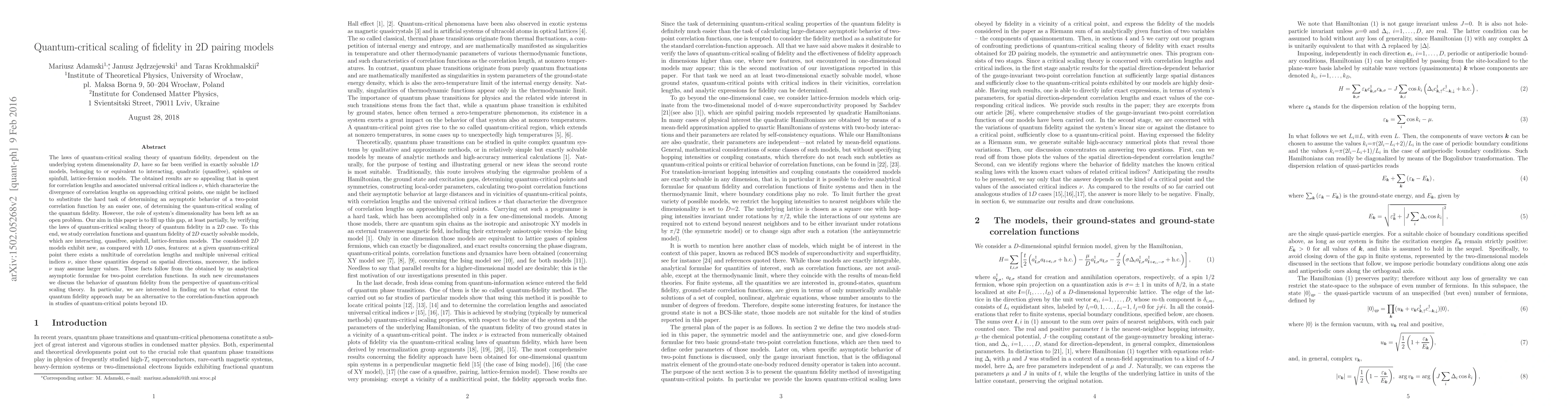 The laws of quantum-critical scaling theory of quantum fidelity, dependent on the underlying system dimensionality $D$, have so far been verified in exactly solvable $1D$ models, belonging to or equivalent to interacting, quadratic (quasifree), spinless or spinfull, lattice-fermion models. The obtained results are so appealing that in quest for correlation lengths and associated universal critical indices $\nu$, which characterize the divergence of correlation lengths on approaching critical points, one might be inclined to substitute the hard task of determining an asymptotic behavior of a two-point correlation function by an easier one, of determining the quantum-critical scaling of the quantum fidelity. However, the role of system's dimensionality has been left as an open problem. Our aim in this paper is to fill up this gap, at least partially, by verifying the laws of quantum-critical scaling theory of quantum fidelity in a $2D$ case. To this end, we study correlation functions and quantum fidelity of $2D$ exactly solvable models, which are interacting, quasifree, spinfull, lattice-fermion models. The considered $2D$ models exhibit new, as compared with $1D$ ones, features:at a given quantum-critical point there exists a multitude of correlation lengths and multiple universal critical indices $\nu$, since these quantities depend on spatial directions, moreover, the indices $\nu$ may assume larger values. These facts follow from the obtained by us analytical asymptotic formulae for two-point correlation functions. In such new circumstances we discuss the behavior of quantum fidelity from the perspective of quantum-critical scaling theory. In particular, we are interested in finding out to what extent the quantum fidelity approach may be an alternative to the correlation-function approach in studies of quantum-critical points beyond 1D.