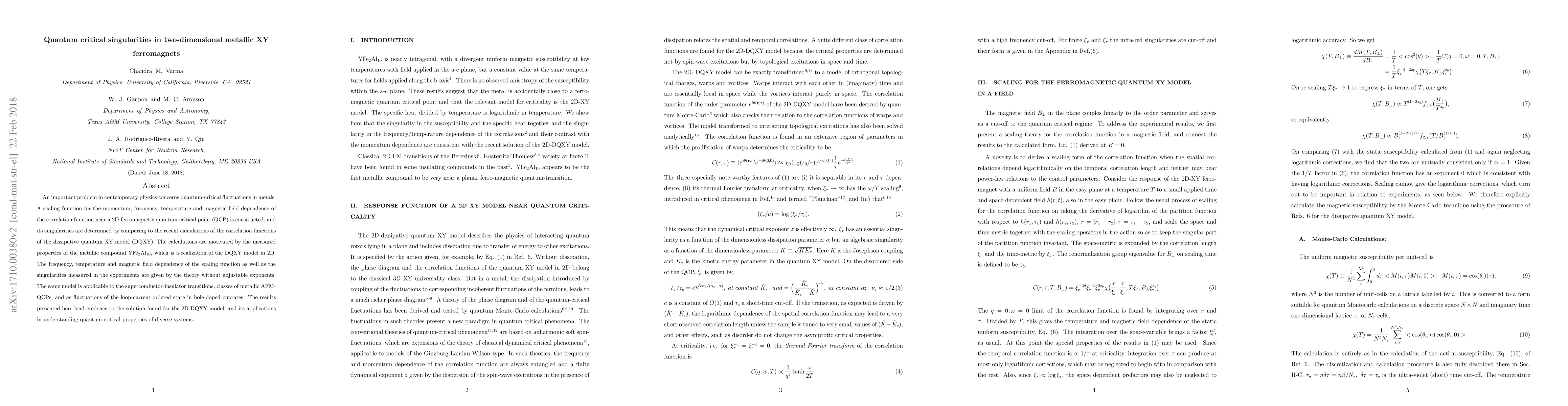 An important problem in contemporary physics concerns quantum-critical fluctuations in metals. A scaling function for the momentum, frequency, temperature and magnetic field dependence of the correlation function near a 2D-ferromagnetic quantum-critical point (QCP) is constructed, and its singularities are determined by comparing to the recent calculations of the correlation functions of the dissipative quantum XY model (DQXY). The calculations are motivated by the measured properties of the metallic compound YFe$_2$Al$_{10}$, which is a realization of the DQXY model in 2D. The frequency, temperature and magnetic field dependence of the scaling function as well as the singularities measured in the experiments are given by the theory without adjustable exponents. The same model is applicable to the superconductor-insulator transitions, classes of metallic AFM-QCPs, and as fluctuations of the loop-current ordered state in hole-doped cuprates. The results presented here lend credence to the solution found for the 2D-DQXY model, and its applications in understanding quantum-critical properties of diverse systems.