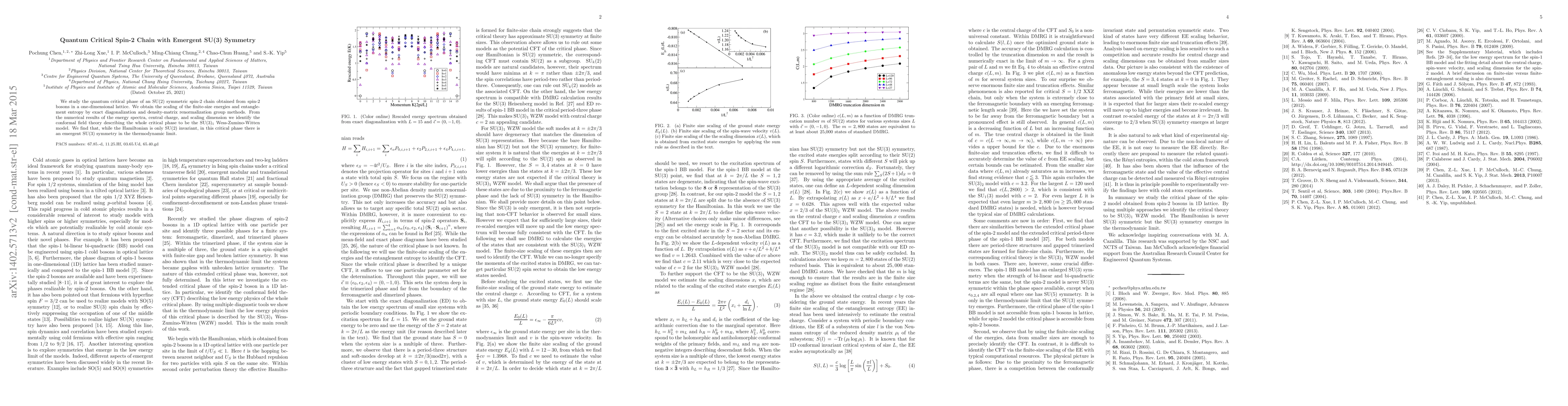 We study the quantum critical phase of a SU(2) symmetric spin-2 chain obtained from spin-2 bosons in a one-dimensional lattice. We obtain the scaling of the entanglement entropy and finite-size energies by exact diagonalization and density-matrix renormalization group methods. From the numerical results of the energy spectrum, central charge, and scaling dimension we identify the conformal field theory describing the whole critical phase to be the SU(3)$_1$ Wess-Zumino-Witten model. We find that while in the whole critical phase the Hamiltonian is only SU(2) invariant, there is an emergent SU(3) symmetry in the thermodynamic limit.