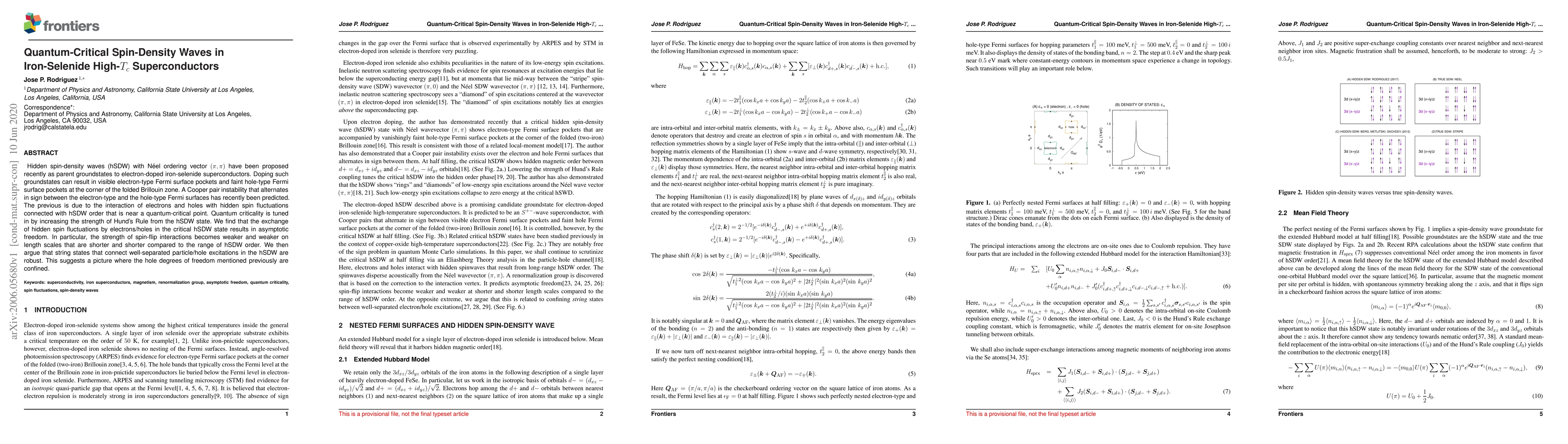 This paper investigates the quantum-critical spin-density waves in iron-selenide high-temperature superconductors, proposing that hidden spin-density waves near a quantum-critical point lead to asymptotic freedom and robust string states connecting electron and hole excitations. The study suggests that spin-flip interactions weaken significantly on short length scales relative to the spin-density wave order.