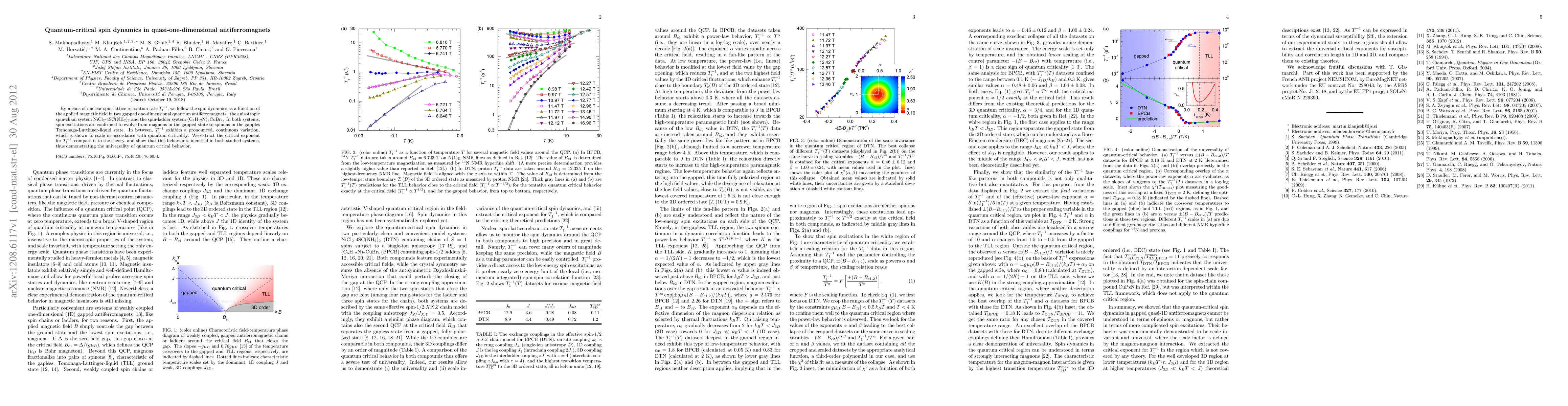 This paper investigates the spin dynamics in two quasi-one-dimensional quantum antiferromagnets using nuclear spin-lattice relaxation rate 1/T1, revealing a transition from magnons to spinons. The study finds a universal quantum critical scaling behavior in both systems, confirming the universality of quantum critical phenomena.