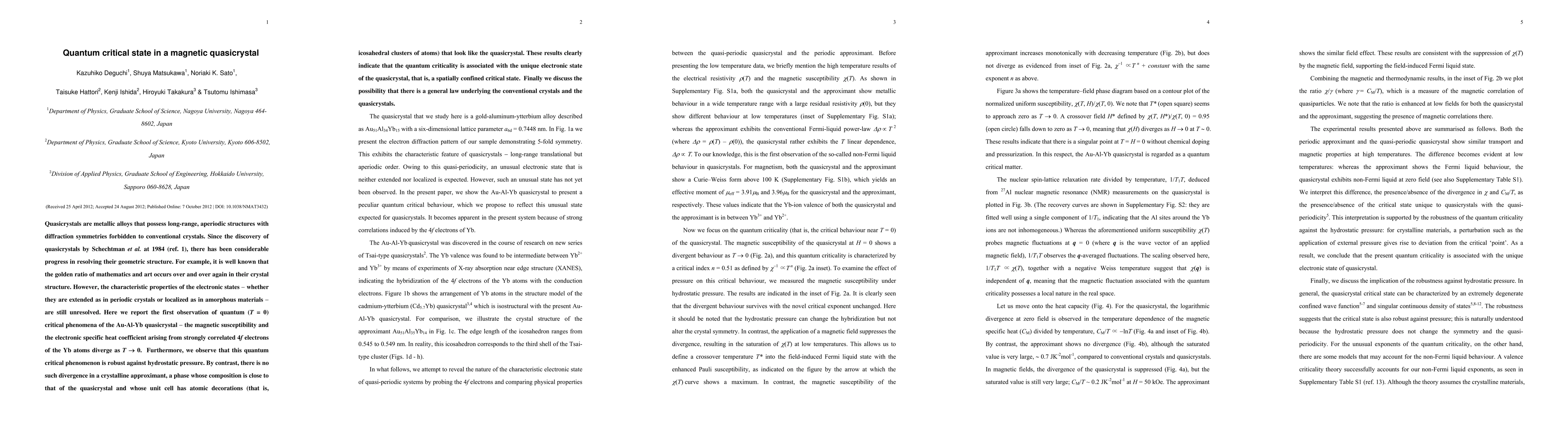 Quasicrystals are metallic alloys that possess long-range, aperiodic structures with diffraction symmetries forbidden to conventional crystals. Since the discovery of quasicrystals by Schechtman et al. at 1984 (ref. 1), there has been considerable progress in resolving their geometric structure. For example, it is well known that the golden ratio of mathematics and art occurs over and over again in their crystal structure. However, the characteristic properties of the electronic states - whether they are extended as in periodic crystals or localized as in amorphous materials - are still unresolved. Here we report the first observation of quantum (T = 0) critical phenomena of the Au-Al-Yb quasicrystal - the magnetic susceptibility and the electronic specific heat coefficient arising from strongly correlated 4f electrons of the Yb atoms diverge as T -> 0. Furthermore, we observe that this quantum critical phenomenon is robust against hydrostatic pressure. By contrast, there is no such divergence in a crystalline approximant, a phase whose composition is close to that of the quasicrystal and whose unit cell has atomic decorations (that is, icosahedral clusters of atoms) that look like the quasicrystal. These results clearly indicate that the quantum criticality is associated with the unique electronic state of the quasicrystal, that is, a spatially confined critical state. Finally we discuss the possibility that there is a general law underlying the conventional crystals and the quasicrystals.