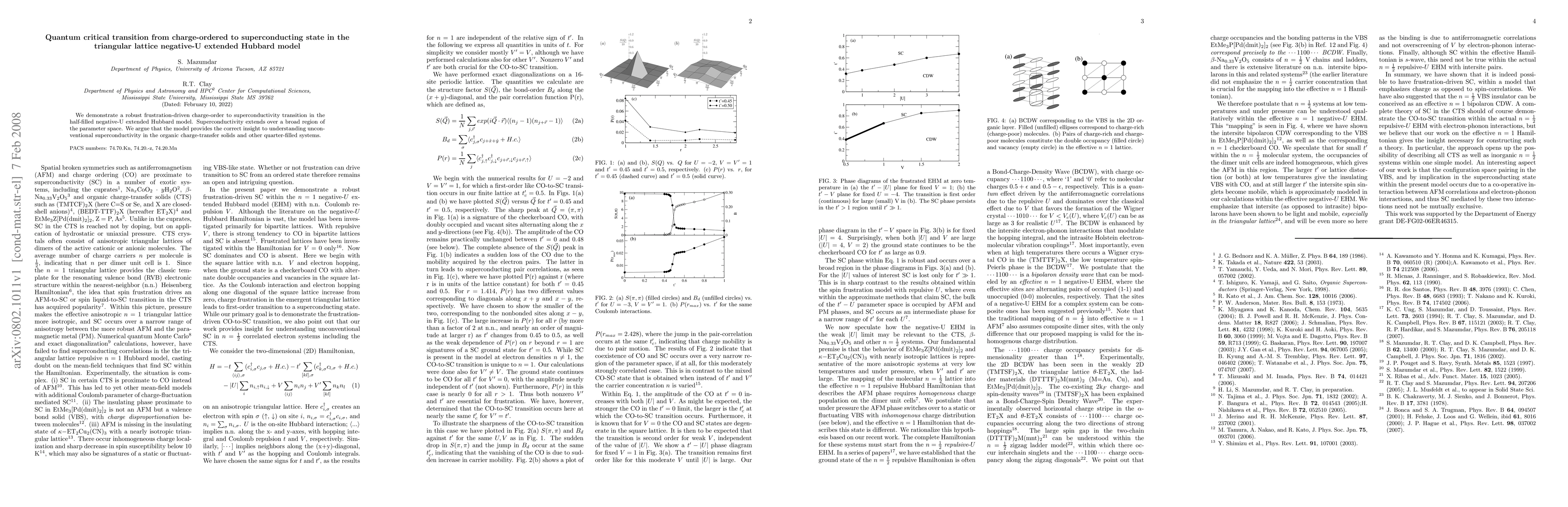 This paper investigates a quantum critical transition in the triangular lattice negative-U extended Hubbard model, showing a frustration-driven shift from charge-ordered to superconducting states. The findings suggest the model can elucidate unconventional superconductivity in organic charge-transfer solids and similar quarter-filled systems.
