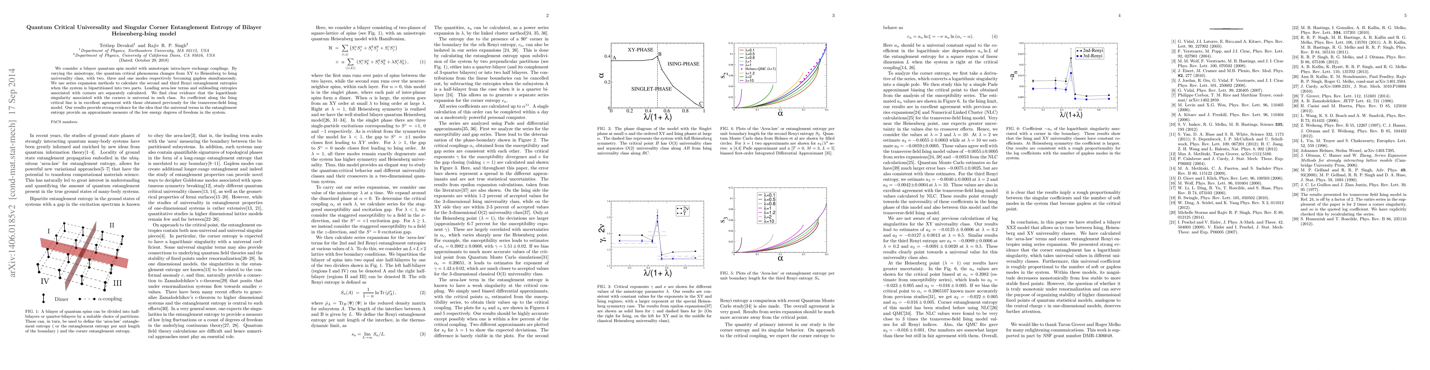 This paper investigates the quantum critical behavior of a bilayer Heisenberg-Ising model, demonstrating how varying anisotropy alters the universality class and entanglement entropy. It finds universal logarithmic singularities in corner entanglement entropy, consistent with previous results for the transverse-field Ising model, supporting the notion that entanglement entropy terms reflect low-energy degrees of freedom.