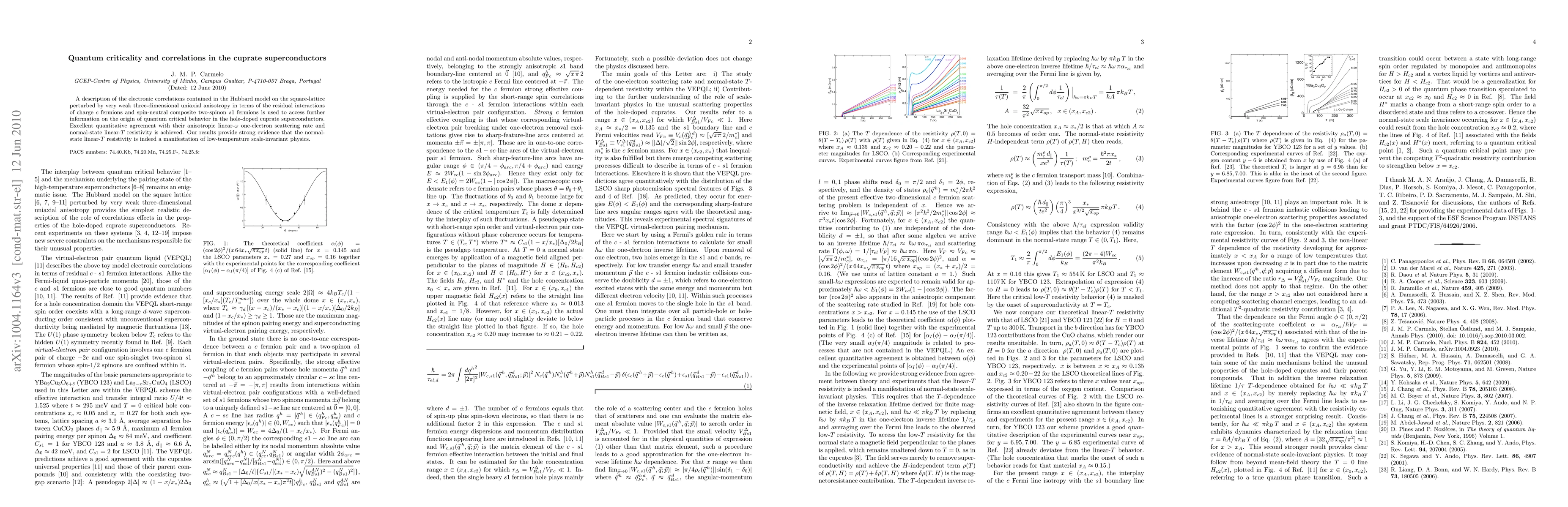A description of the electronic correlations contained in the Hubbard model on the square-lattice perturbed by very weak three-dimensional uniaxial anisotropy in terms of the residual interactions of charge $c$ fermions and spin-neutral composite two-spinon $s1$ fermions is used to access further information on the origin of quantum critical behavior in the hole-doped cuprate superconductors. Excellent quantitative agreement with their anisotropic linear-$\omega$ one-electron scattering rate and normal-state linear-$T$ resistivity is achieved. Our results provide strong evidence that the normal-state linear-$T$ resistivity is indeed a manifestation of low-temperature scale-invariant physics.