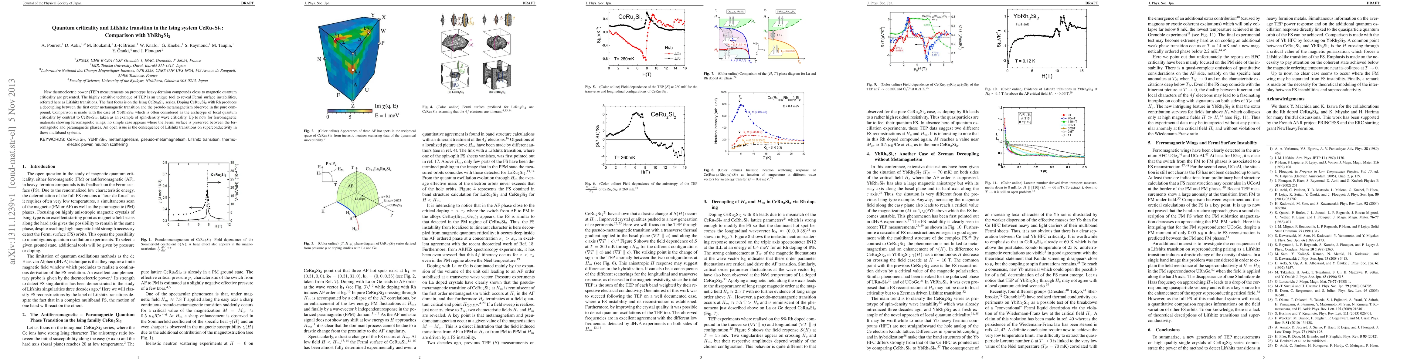 New thermoelectric power (TEP) measurements on prototype heavy-fermion compounds close to magnetic quantum criticality are presented. The highly sensitive technique of TEP is an unique tool to reveal Fermi surface instabilities, referred here as Lifshitz transitions. The first focus is on the Ising CeRu2Si2 series. Doping CeRu2Si2 with Rh produces a decoupling between the first order metamagnetic transition and the pseudo-metamagnetism observed in the pure compound. Comparison is made with the case of YbRh2Si2 which is often considered as the archetype of local quantum criticality by contrast to CeRu2Si2, taken as an example of spin-density wave criticality. Up to now for ferromagnetic materials showing ferromagnetic wings, no simple case appears where the Fermi surface is preserved between the ferromagnetic and paramagnetic phases. An open issue is the consequence of Lifshitz transitions on superconductivity in these multiband systems.