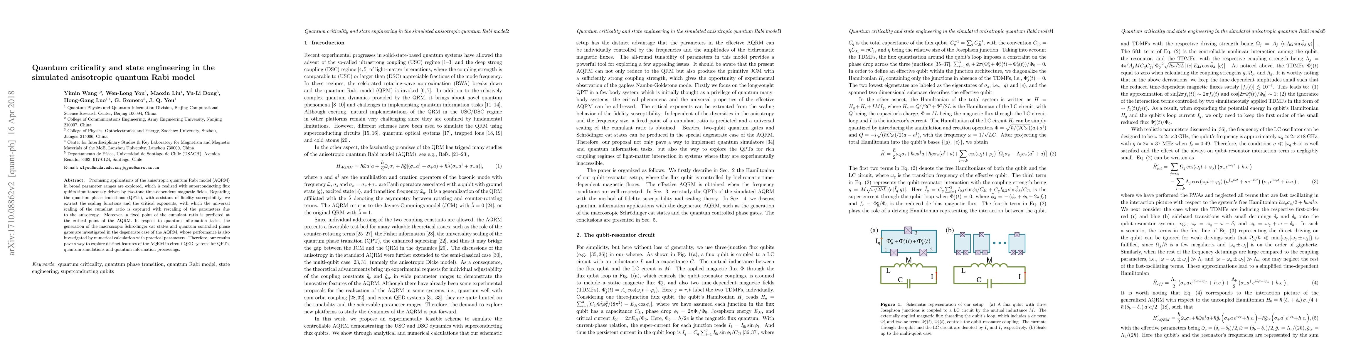 Researchers explored the anisotropic quantum Rabi model's potential for quantum phase transitions, macroscopic Schr"{o}dinger cat states, and quantum information tasks, discovering a universal scaling of the cumulant ratio at critical points.