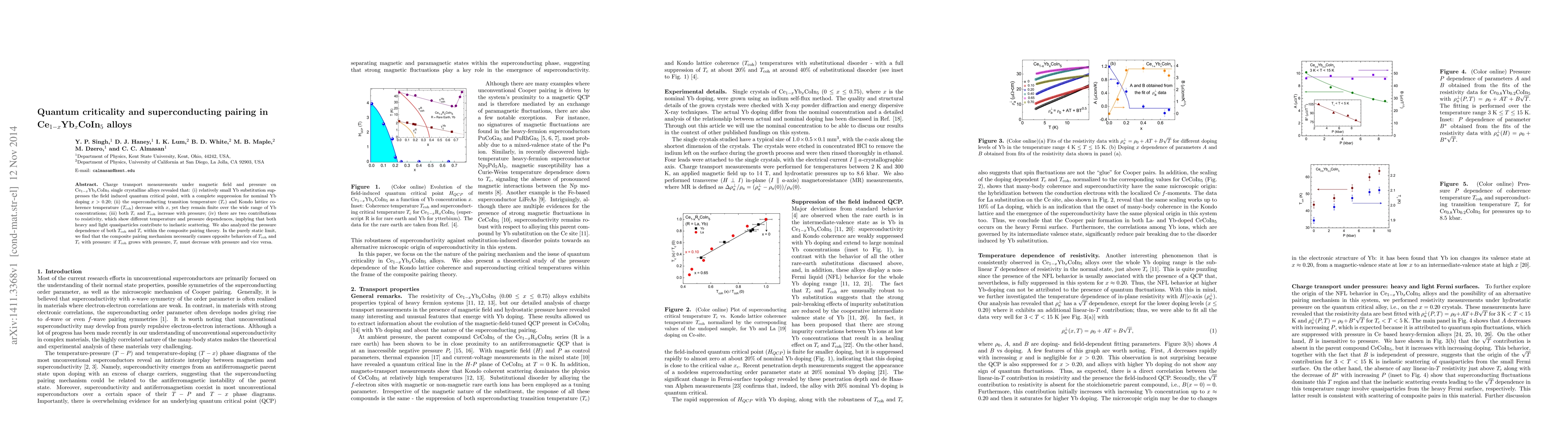In this paper we review some of our recent experimental and theoretical results on transport and thermodynamic properties of heavy-fermion alloys Ce(1-x)Yb(x)CoIn5. Charge transport measurements under magnetic field and pressure on these single crystalline alloys revealed that: (i) relatively small Yb substitution suppresses the field induced quantum critical point, with a complete suppression for nominal Yb doping x>0.20; (ii) the superconducting transition temperature Tc and Kondo lattice coherence temperature T* decrease with x, yet they remain finite over the wide range of Yb concentrations; (iii) both Tc and T* increase with pressure; (iv) there are two contributions to resistivity, which show different temperature and pressure dependences, implying that both heavy and light quasiparticles contribute to inelastic scattering. We also analyzed theoretically the pressure dependence of both T* and Tc within the composite pairing theory. In the purely static limit, when we ignore the lattice dynamics, we find that the composite pairing mechanism necessarily causes opposite behaviors of T* and Tc with pressure: if T* grows with pressure, Tc must decrease with pressure and vice versa.