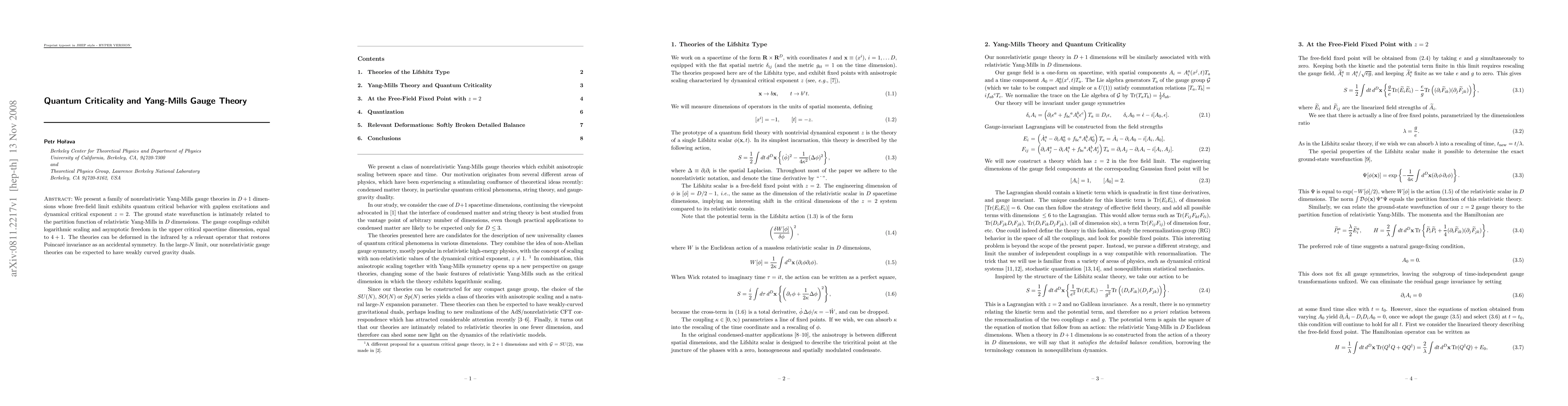 We present a family of nonrelativistic Yang-Mills gauge theories in D+1 dimensions whose free-field limit exhibits quantum critical behavior with gapless excitations and dynamical critical exponent z=2. The ground state wavefunction is intimately related to the partition function of relativistic Yang-Mills in D dimensions. The gauge couplings exhibit logarithmic scaling and asymptotic freedom in the upper critical spacetime dimension, equal to 4+1. The theories can be deformed in the infrared by a relevant operator that restores Poincare invariance as an accidental symmetry. In the large-N limit, our nonrelativistic gauge theories can be expected to have weakly curved gravity duals.