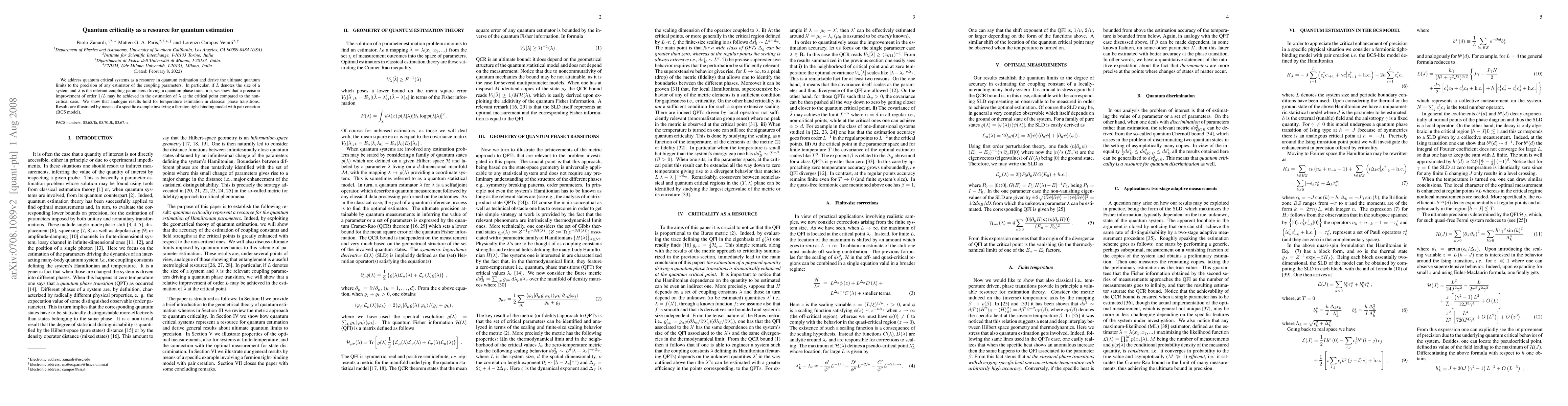 We address quantum critical systems as a resource in quantum estimation and derive the ultimate quantum limits to the precision of any estimator of the coupling parameters. In particular, if L denotes the size of a system and \lambda is the relevant coupling parameters driving a quantum phase transition, we show that a precision improvement of order 1/L may be achieved in the estimation of \lambda at the critical point compared to the non-critical case. We show that analogue results hold for temperature estimation in classical phase transitions. Results are illustrated by means of a specific example involving a fermion tight-binding model with pair creation (BCS model).