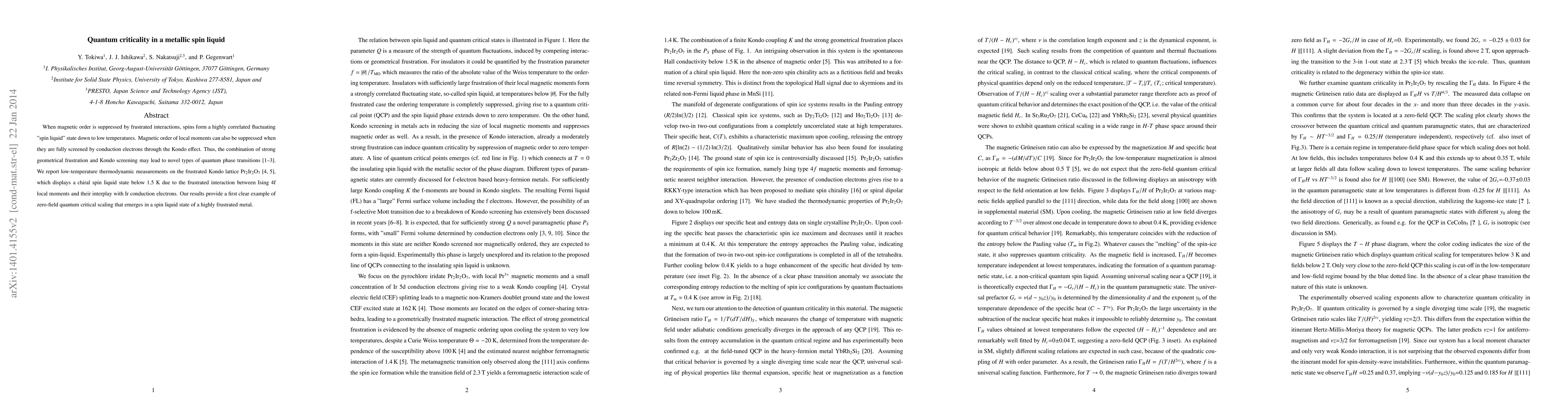 When magnetic order is suppressed by frustrated interactions, spins form a highly correlated fluctuating "spin liquid" state down to low temperatures. Magnetic order of local moments can also be suppressed when they are fully screened by conduction electrons through the Kondo effect. Thus, the combination of strong geometrical frustration and Kondo screening may lead to novel types of quantum phase transitions. We report low-temperature thermodynamic measurements on the frustrated Kondo lattice Pr$_2$Ir$_2$O$_7$, which displays a chiral spin liquid state below 1.5 K due to the frustrated interaction between Ising 4f local moments and their interplay with Ir conduction electrons. Our results provide a first clear example of zero-field quantum critical scaling that emerges in a spin liquid state of a highly frustrated metal.