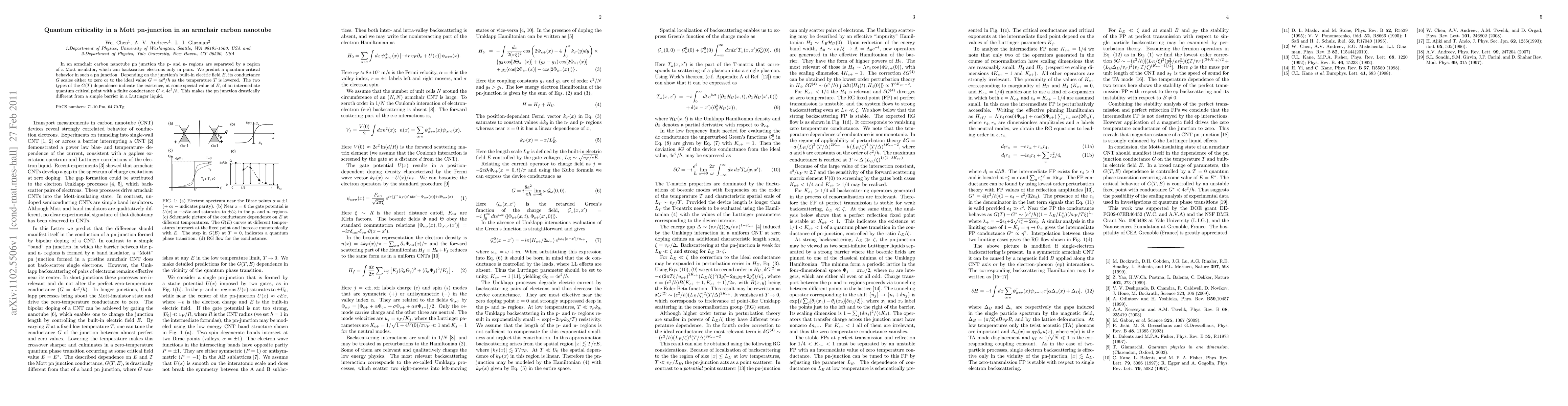 This paper investigates quantum criticality in a pn junction within an armchair carbon nanotube, where a Mott insulator separates the p- and n-regions. The study predicts a unique quantum-critical behavior where the junction's conductance scales to zero or the ideal value G=4e^2/h depending on the electric field, indicating an intermediate quantum critical point with finite conductance at a specific field.