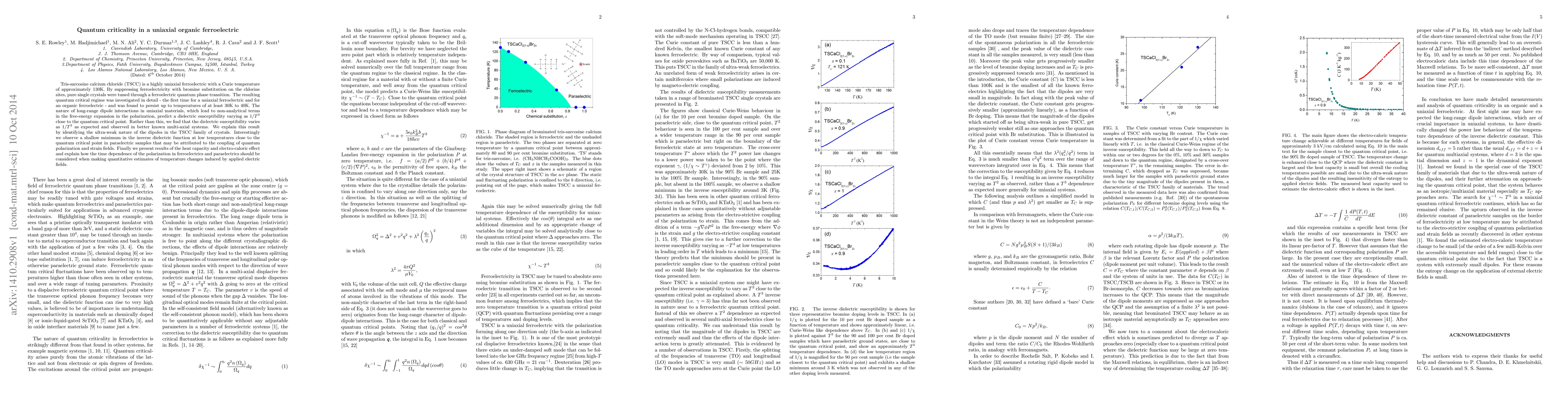 This paper investigates the quantum critical regime in the uniaxial organic ferroelectric TSCC, finding it persists up to 30K-40K. Contrary to predictions, the dielectric susceptibility varies as $1/T^2$ instead of $1/T^3$, attributed to the ultra-weak dipoles in TSCC crystals, and discusses the implications of this behavior on heat capacity and electro-caloric effects.
