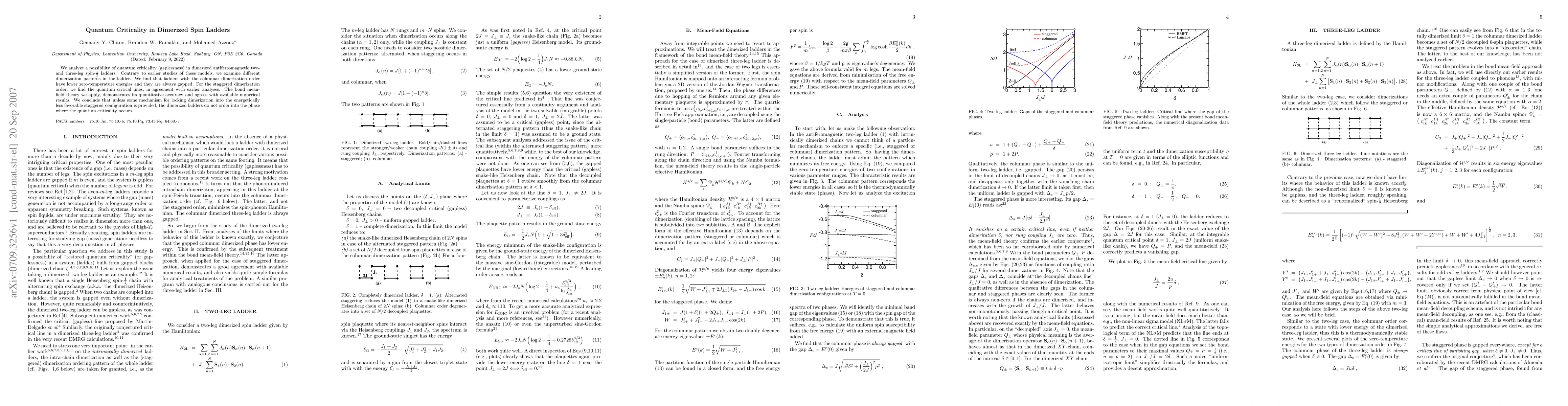 The mean-field theory is applied to study the possibility of quantum criticality in dimerized two- and three-leg ladders, with a focus on columnar and staggered dimerization orders.