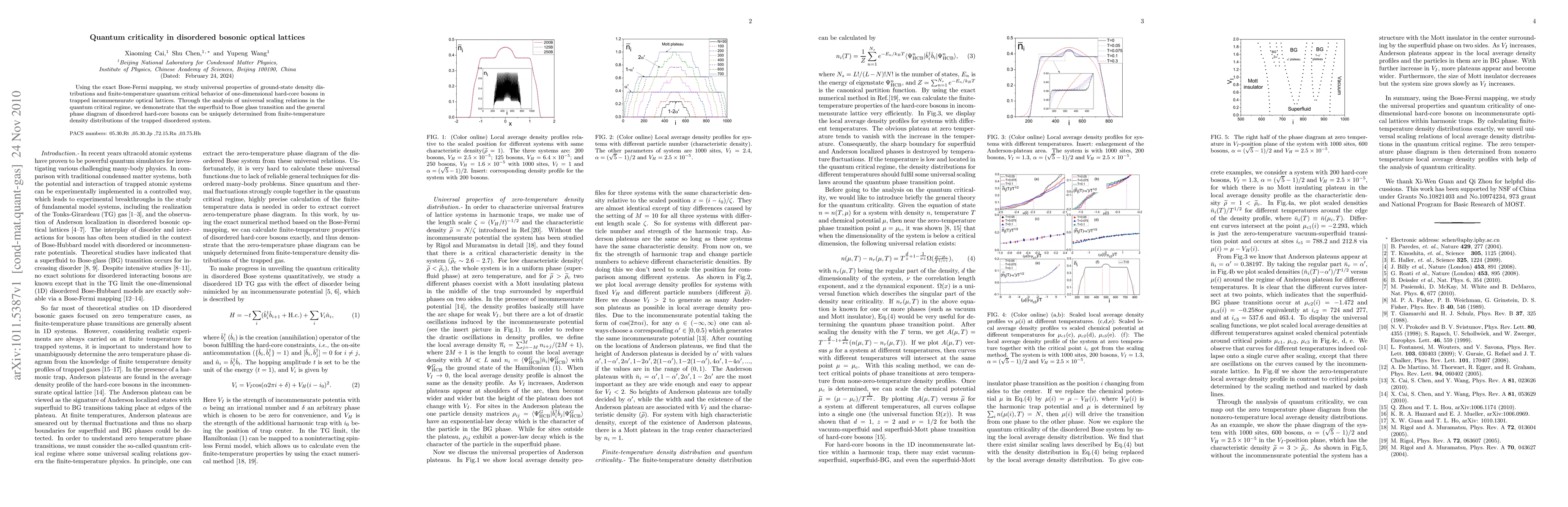 This research explores the quantum critical behavior of one-dimensional hard-core bosons in disordered optical lattices, revealing universal properties of their ground-state density distributions. It concludes that the superfluid to Bose glass transition and the overall phase diagram can be determined from finite-temperature density distributions.