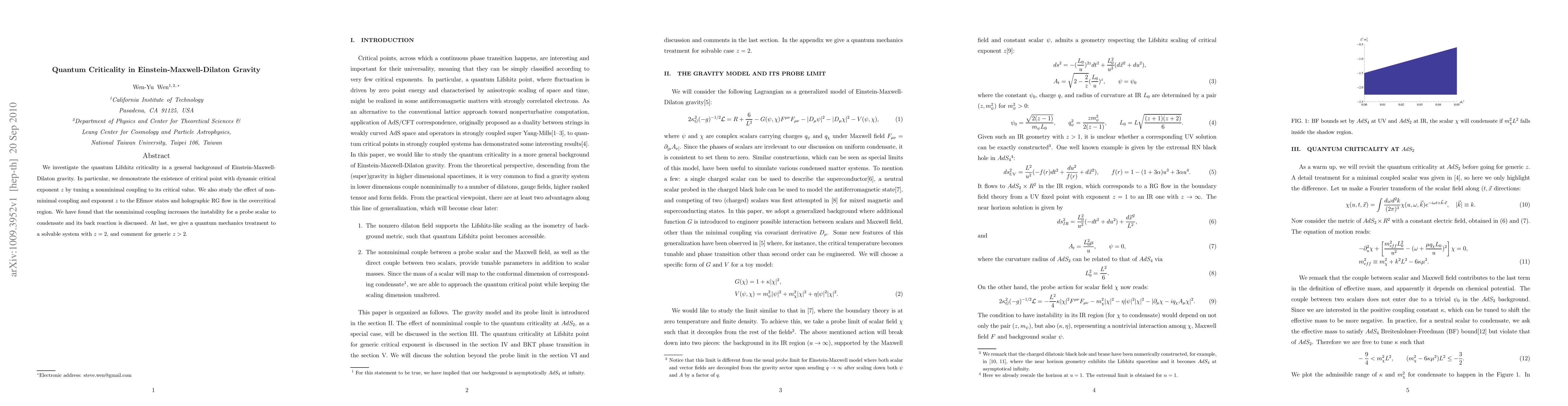 This paper explores quantum Lifshitz criticality in Einstein-Maxwell-Dilaton gravity, demonstrating a critical point with dynamic exponent z via a nonminimal coupling. It examines the effects of this coupling on Efimov states and holographic RG flow, finding that it enhances scalar condensate instability, and provides a quantum mechanics treatment for z=2 systems.
