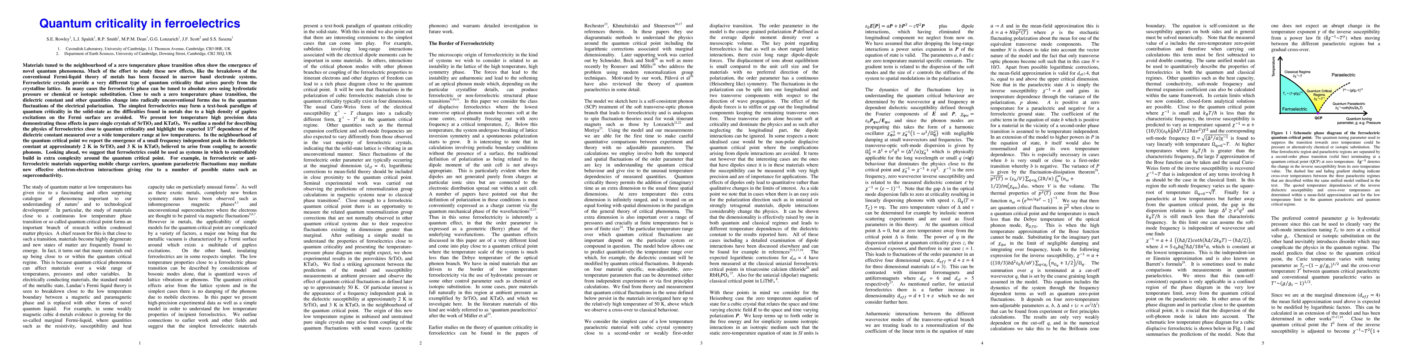 Materials tuned to the neighbourhood of a zero temperature phase transition often show the emergence of novel quantum phenomena. Much of the effort to study these new effects, like the breakdown of the conventional Fermi-liquid theory of metals has been focused in narrow band electronic systems. Ferroelectric crystals provide a very different type of quantum criticality that arises purely from the crystalline lattice. In many cases the ferroelectric phase can be tuned to absolute zero using hydrostatic pressure or chemical or isotopic substitution. Close to such a zero temperature phase transition, the dielectric constant and other quantities change into radically unconventional forms due to the quantum fluctuations of the electrical polarization. The simplest ferroelectrics may form a text-book paradigm of quantum criticality in the solid-state as the difficulties found in metals due to a high density of gapless excitations on the Fermi surface are avoided. We present low temperature high precision data demonstrating these effects in pure single crystals of SrTiO3 and KTaO3. We outline a model for describing the physics of ferroelectrics close to quantum criticality and highlight the expected 1/T2 dependence of the dielectric constant measured over a wide temperature range at low temperatures. In the neighbourhood of the quantum critical point we report the emergence of a small frequency independent peak in the dielectric constant at approximately 2K in SrTiO3 and 3K in KTaO3 believed to arise from coupling to acoustic phonons. Looking ahead, we suggest that in ferroelectric materials supporting mobile charge carriers, quantum paraelectric fluctuations may mediate new effective electron-electron interactions giving rise to a number of possible states such as superconductivity.